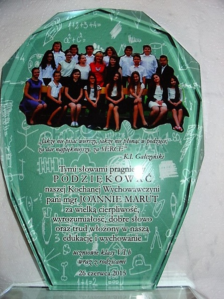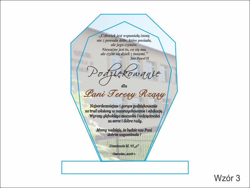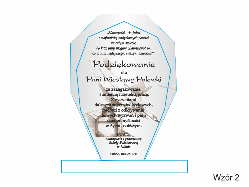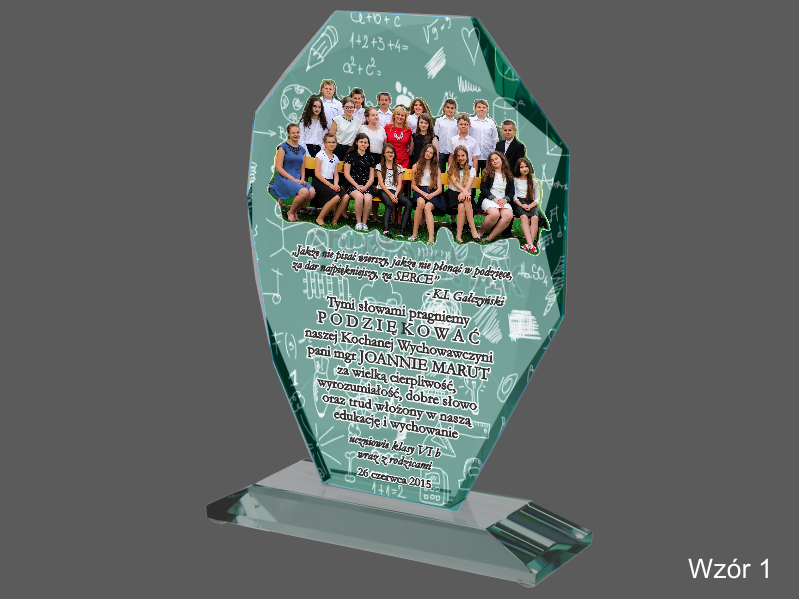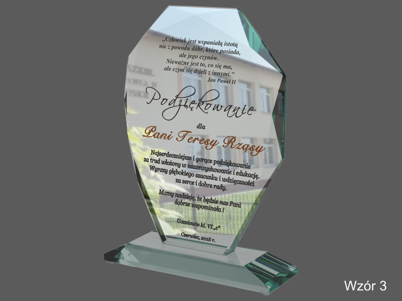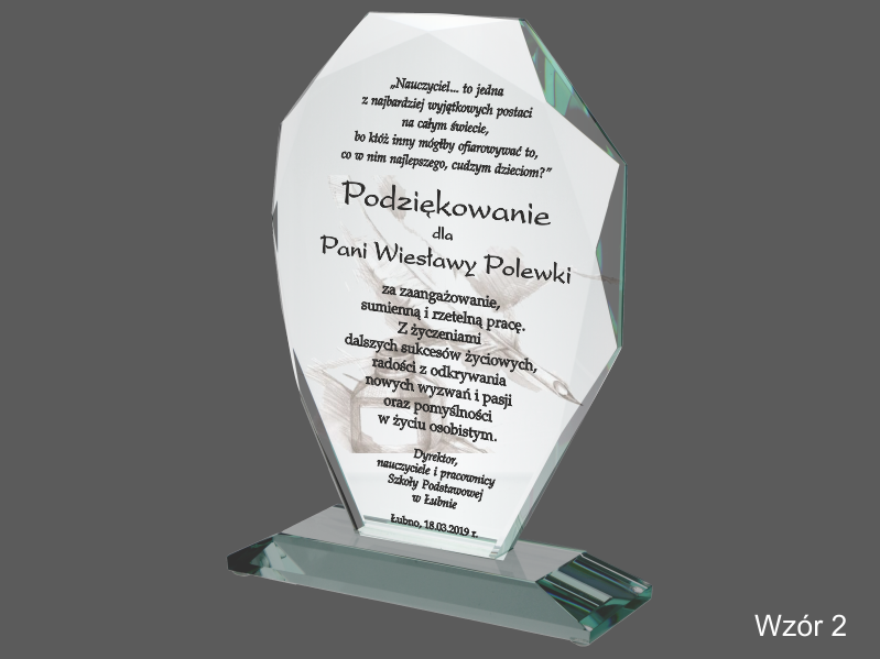 Pamiątkowy nadruk dla Nauczyciela można także wykonać na innych modelach szklanych statuetek.