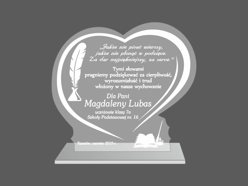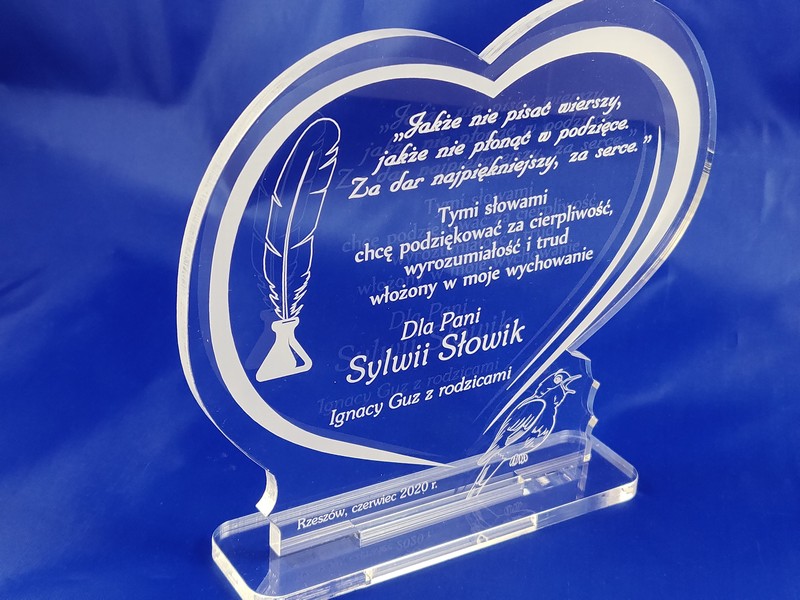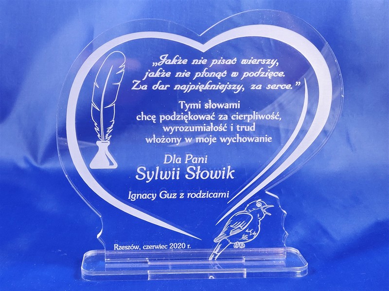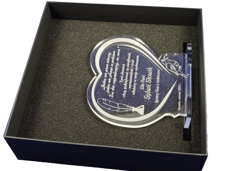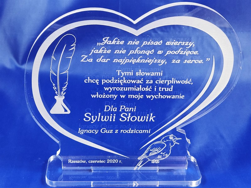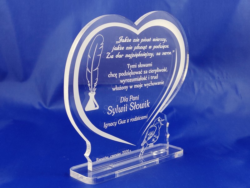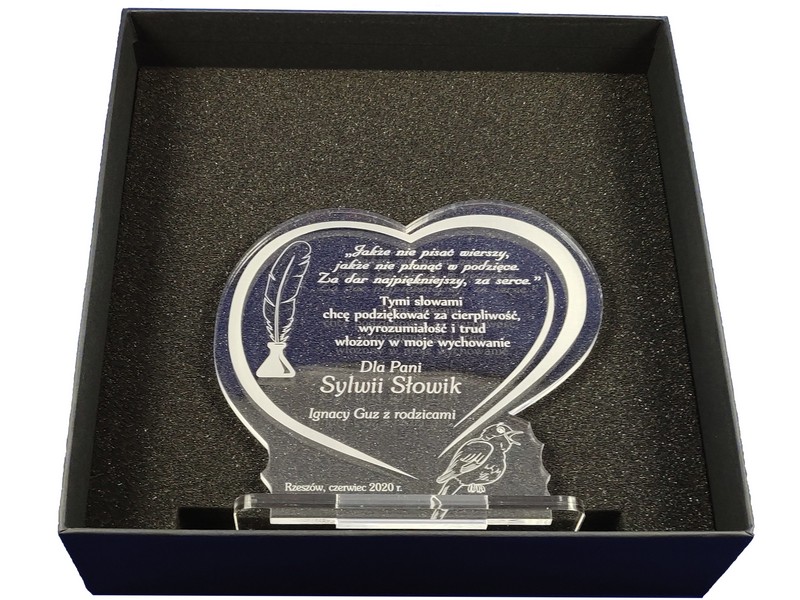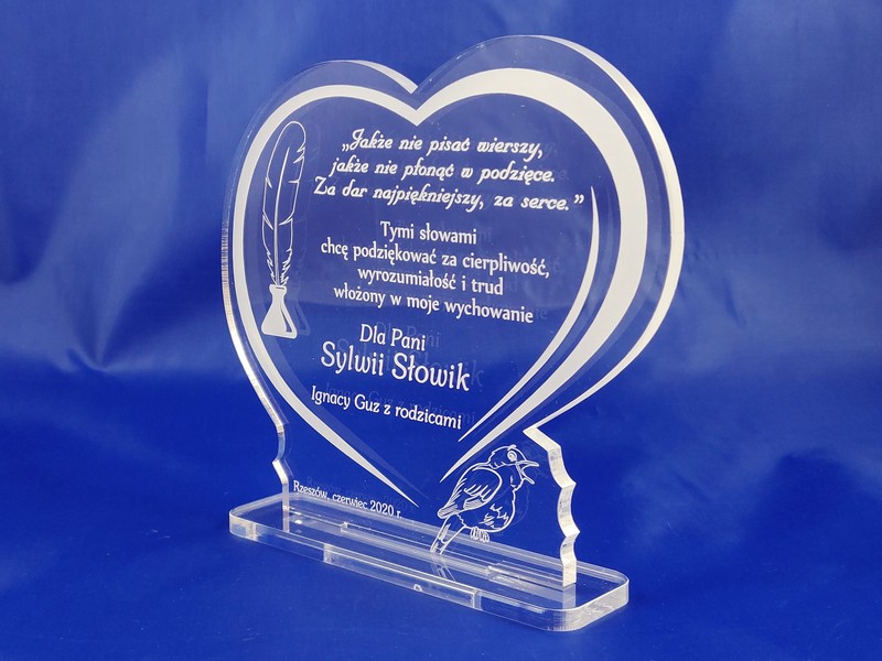Pamiątkowa statuetka dla Nauczyciela wykonana z bezbarwnej pleksi, z grawerem dedykacji i ozdobnych grafik w kształcie serca.