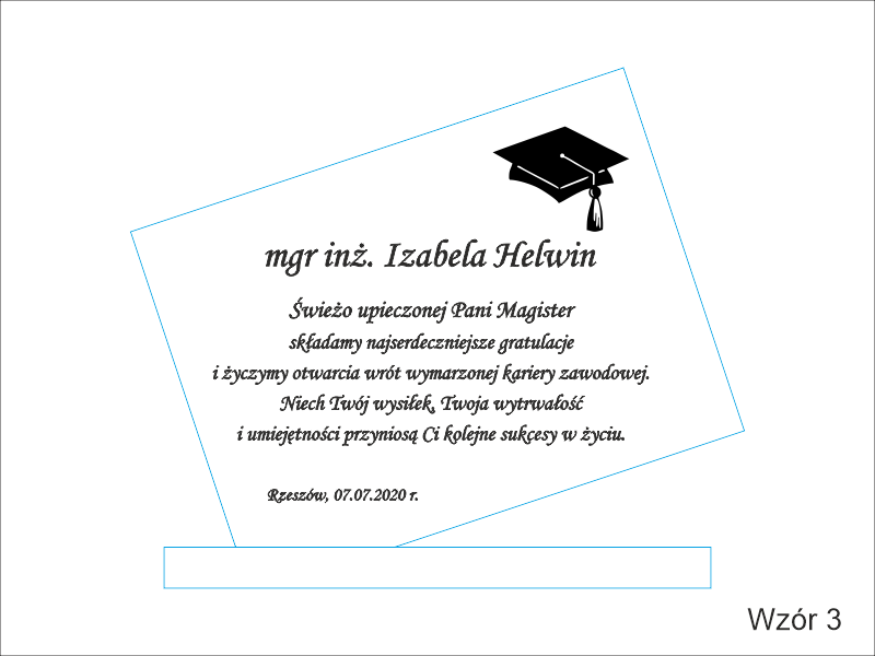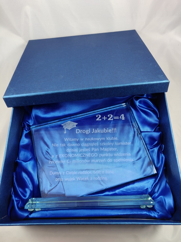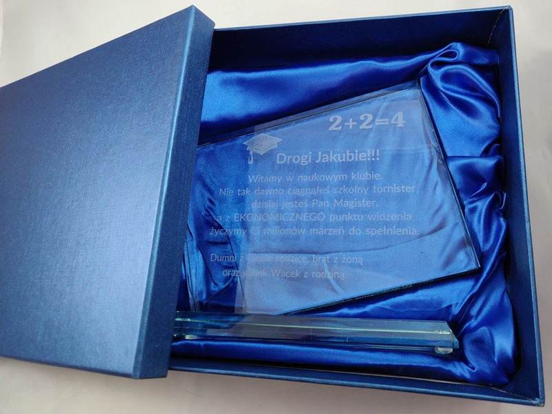 Gratulacje z okazji ukończenia studiów w postaci pamiątkowej statuetki szklanej z grawerem dedykacji.