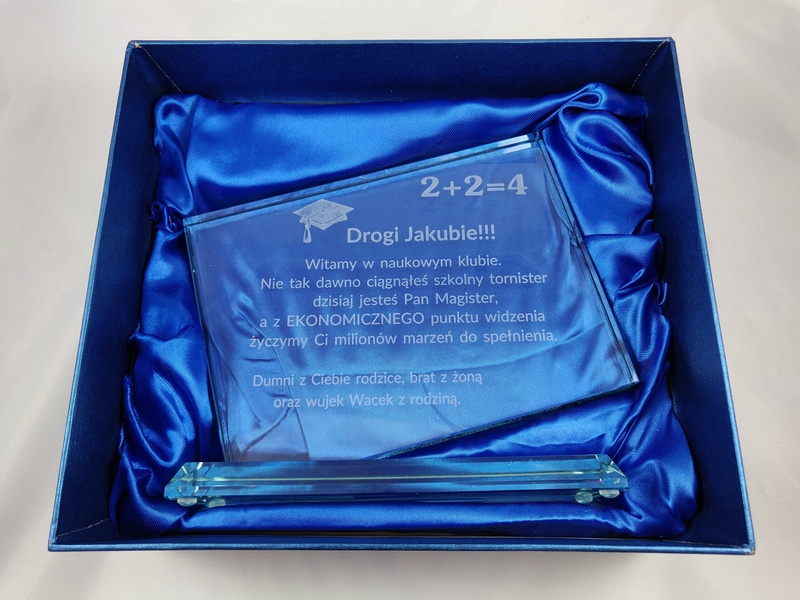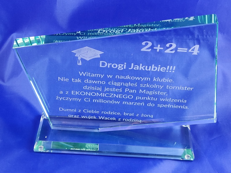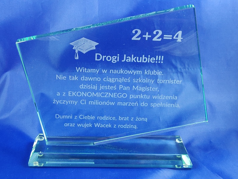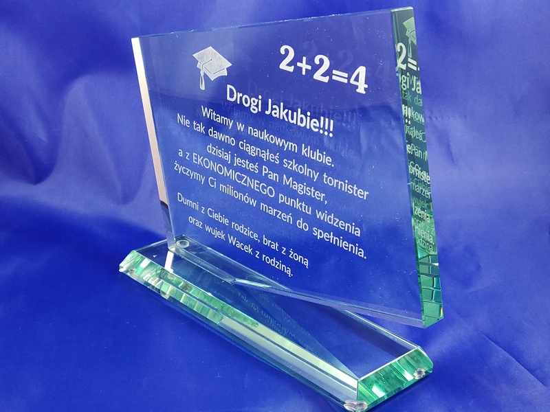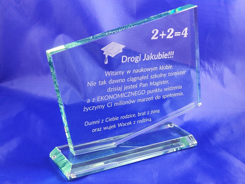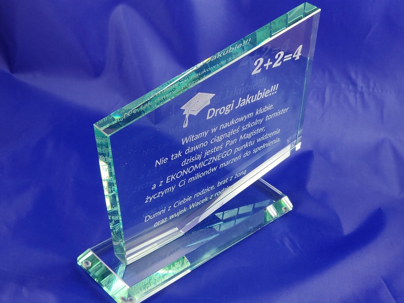 Pamiątkowy grawer dla absolwenta uczelni można także wykonać na innych modelach szklanych statuetek.