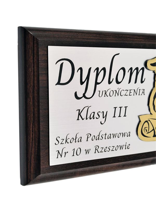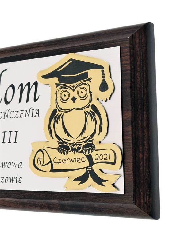 Dedykacja z okazji zakończenia szkoły czy nauki wygrawerowana jest w srebrnym laminacie umieszczonym na drewnianym podkładzie.