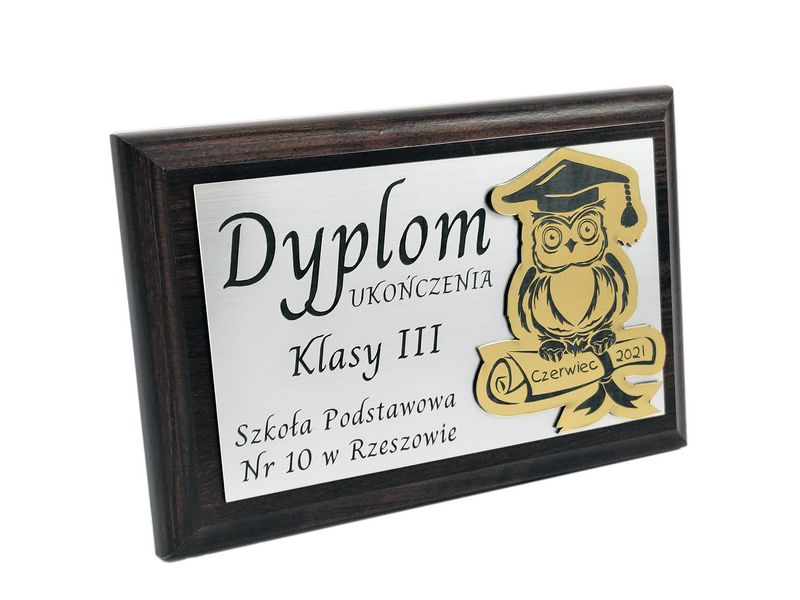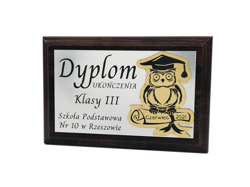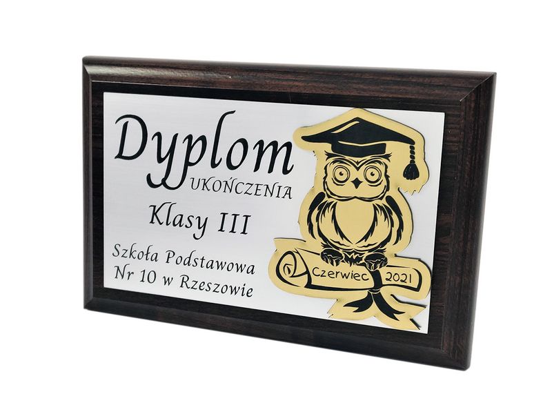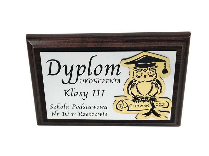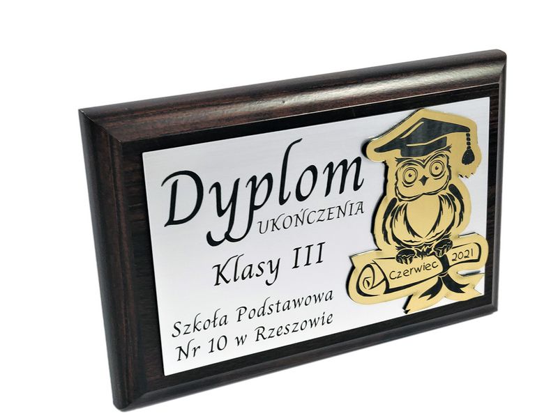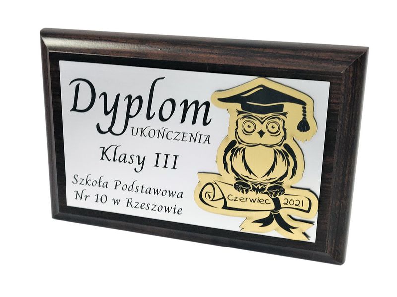Pamiątka ukończenia nauki w postaci drewnianego dyplomu okolicznościowego z wizerunkiem "Mądrej Sowy".