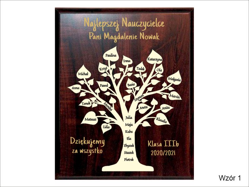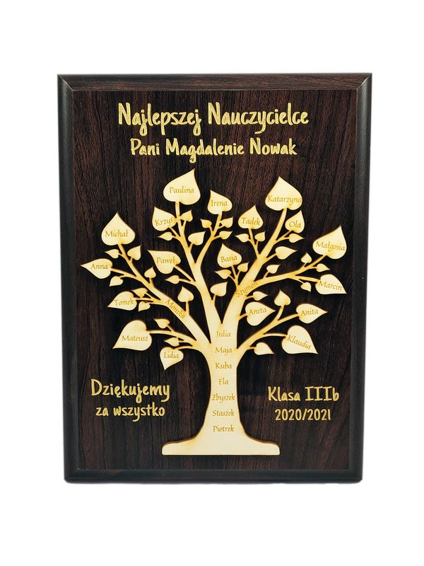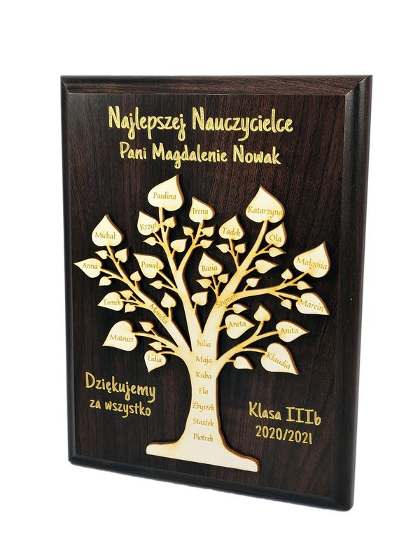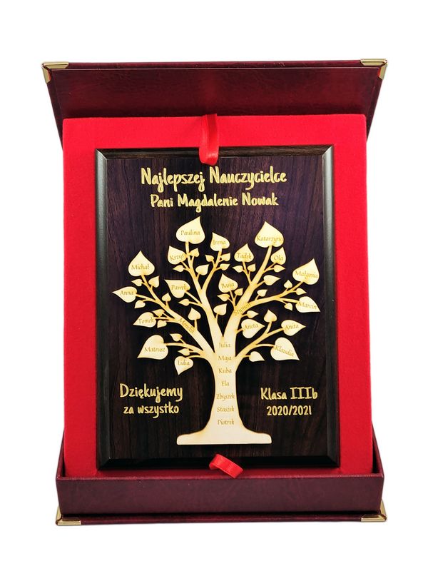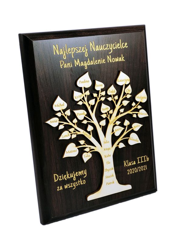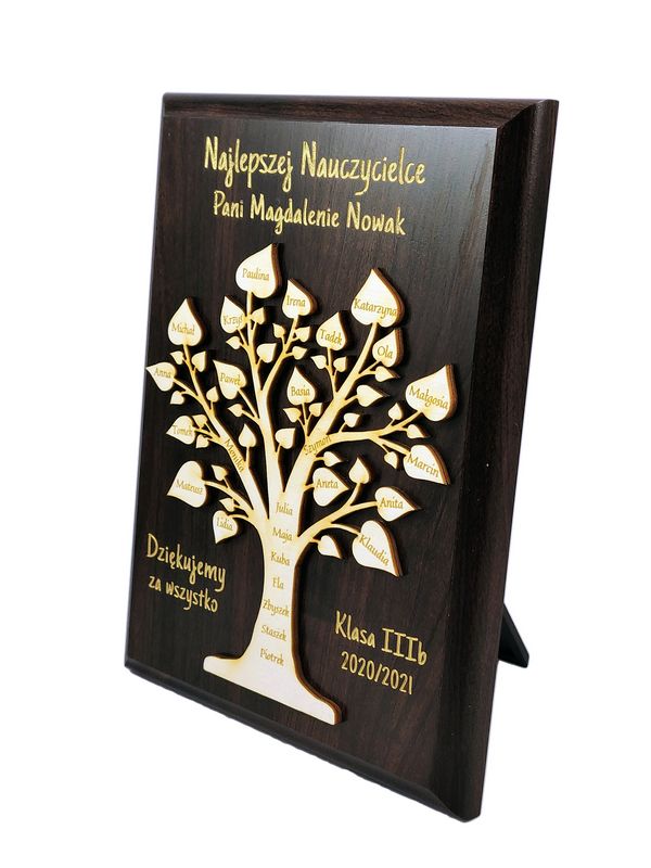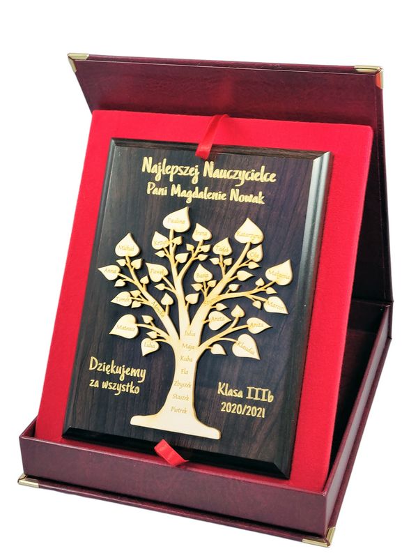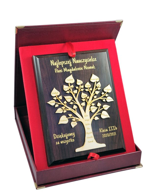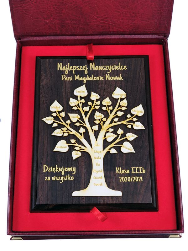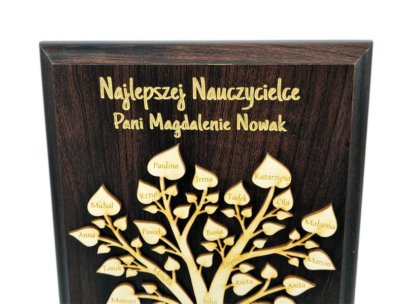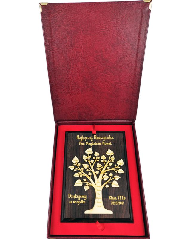 Podziękowanie dla Nauczyciela w postaci wyjątkowego drewnianego dyplomu okolicznościowego z Drzewkiem Szczęścia.