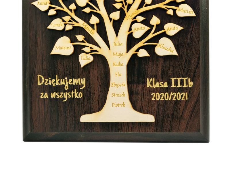 Na listkach drzewka oraz pniu wygrawerowane są poszczególne imiona dzieci będących uczniami kasy.