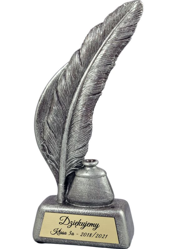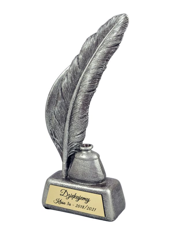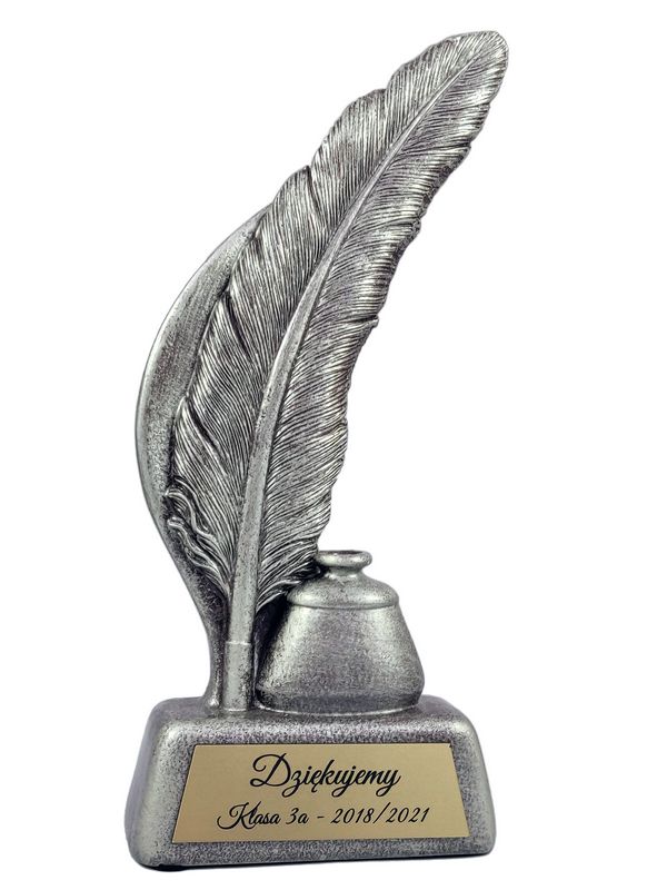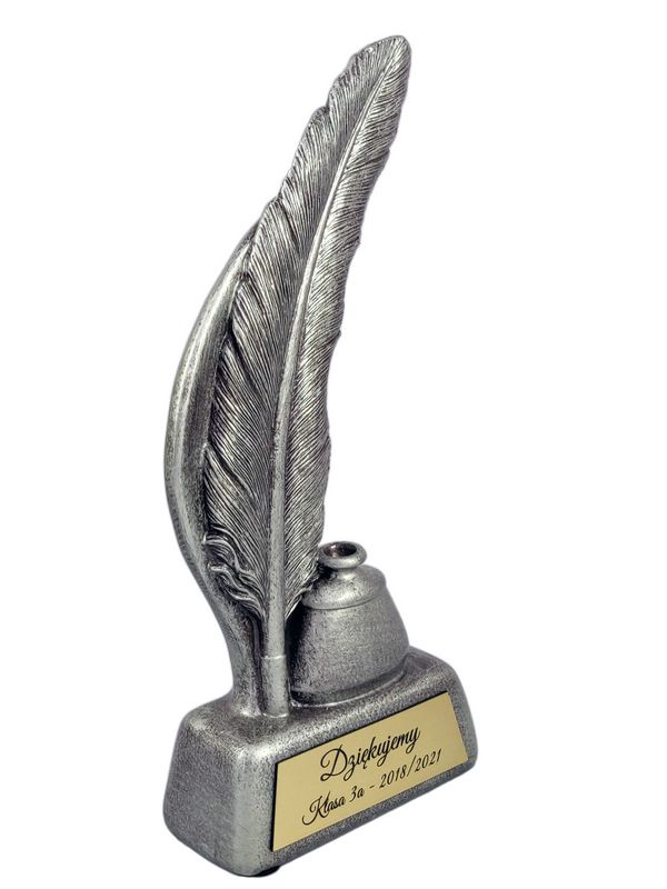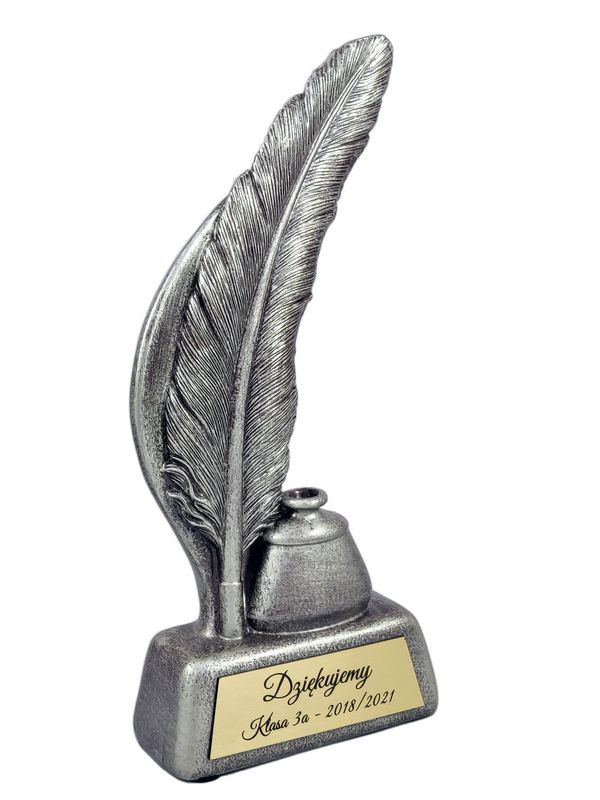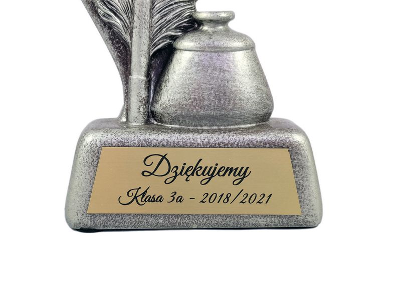 Podziękowanie dla Nauczyciela w formie srebrnej odlewanej statuetki w kształcie gęsiego pióra i kałamarza z grawerem.