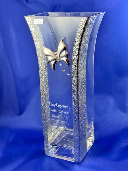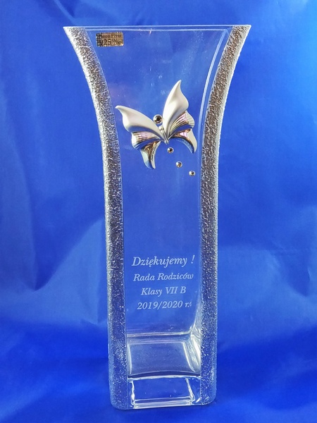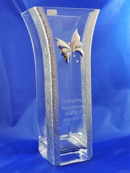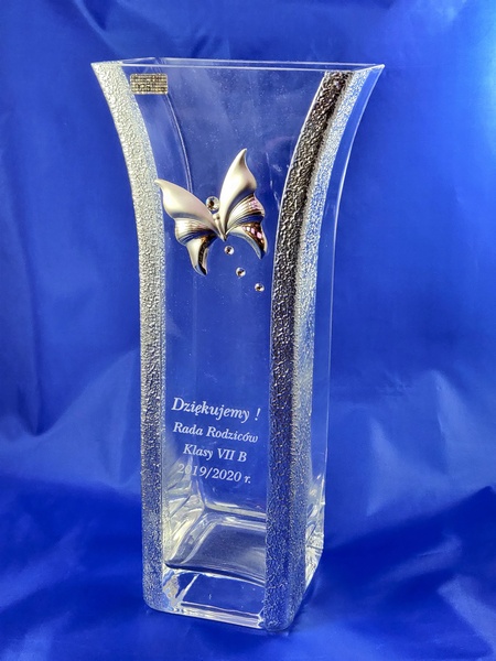 Podziękowanie dla Nauczyciela w postaci wazonu szklanego zdobionego Butterfly z ozdobnym srebrnym motylem i grawerem dedykacji.