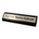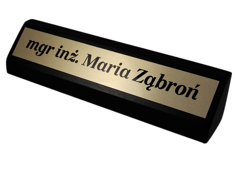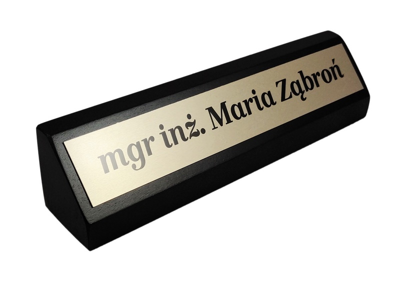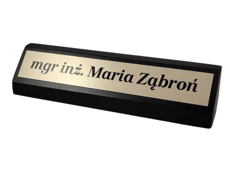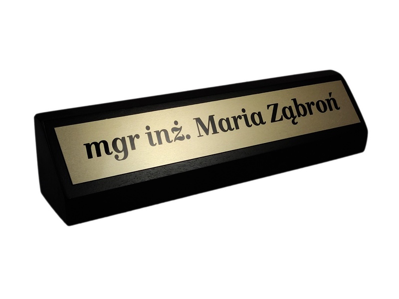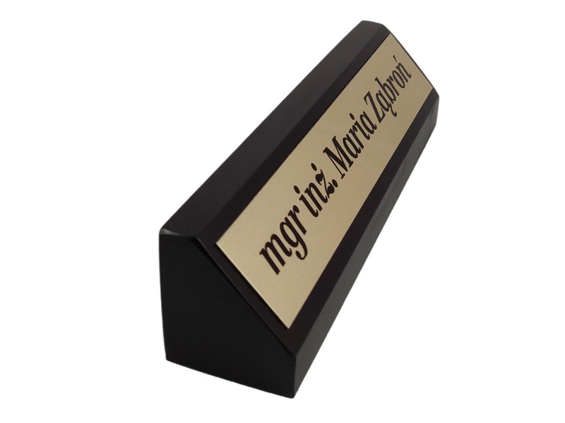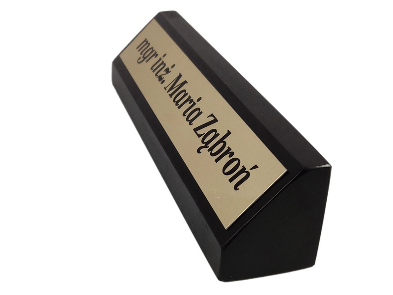 Wizytówka wykonana jest ze złotej tabliczlki przymocowanej do drewnianej podstawki.