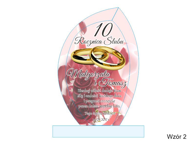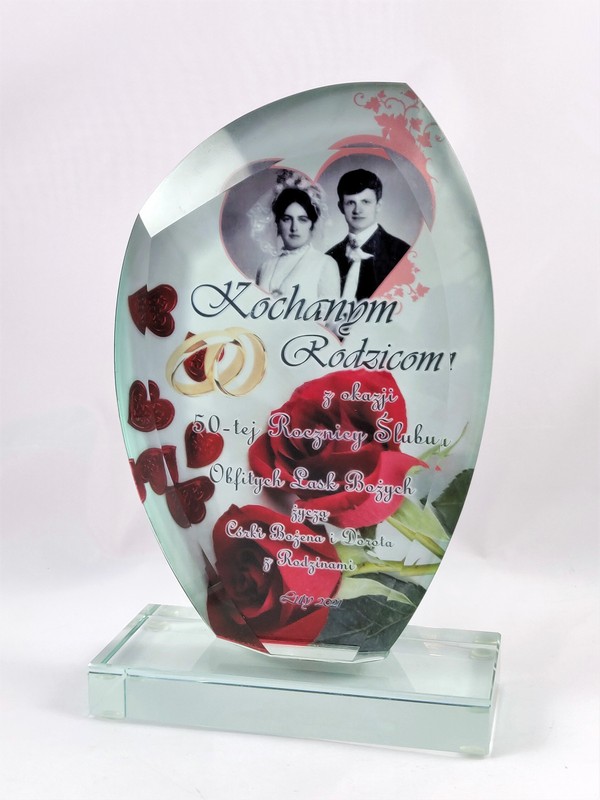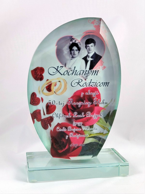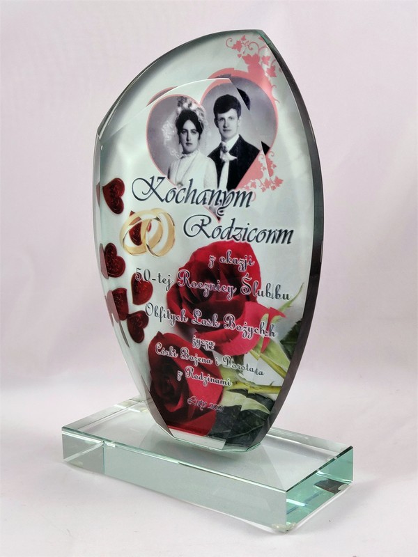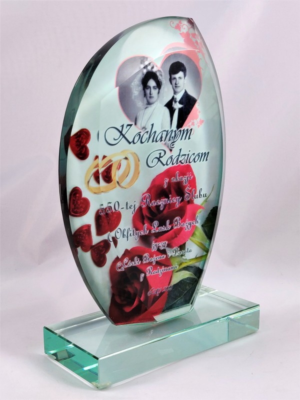 Pamiątkowa statuetka szklana G010 z grubego szlifowanego szkła w kształcie żagla z nadrukiem dedykacji z okazji Rocznicy Ślubu.