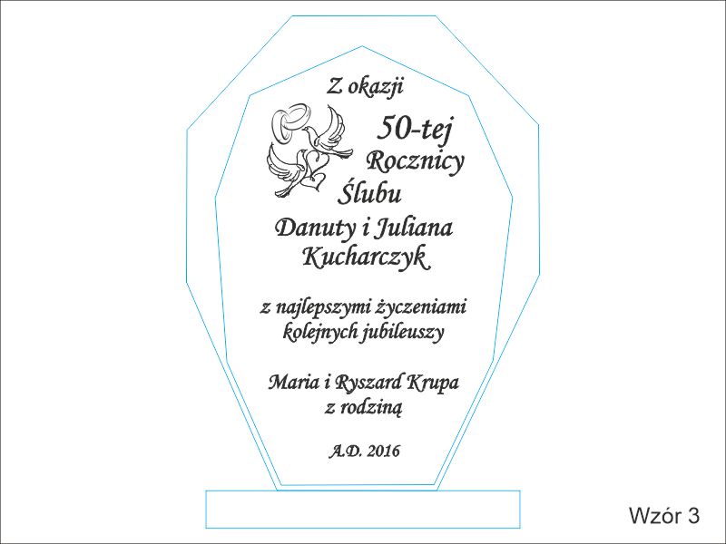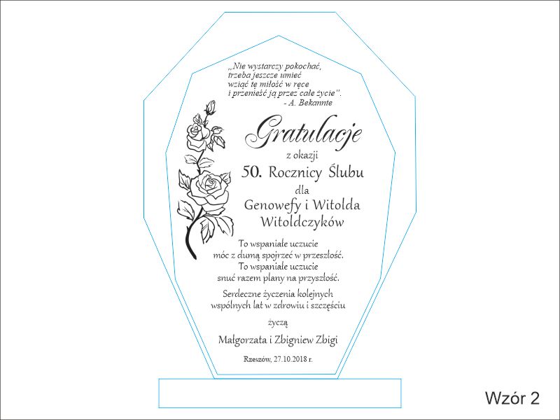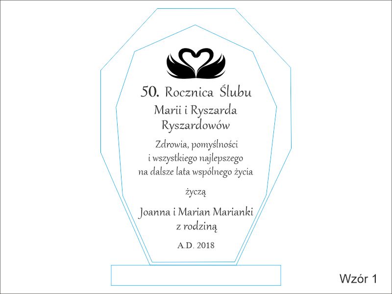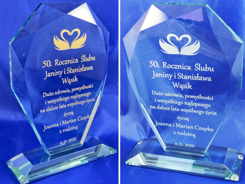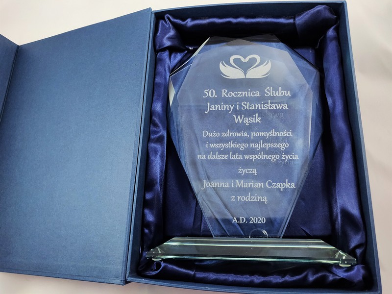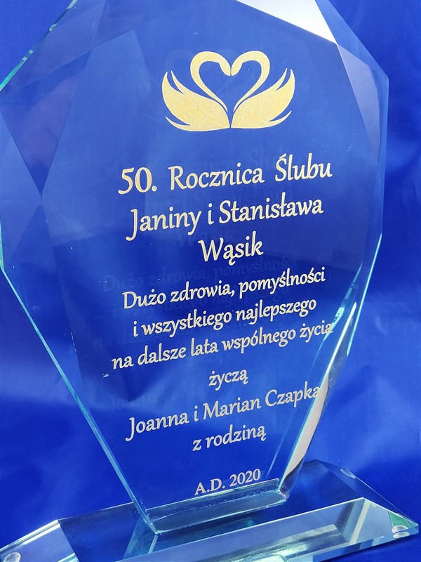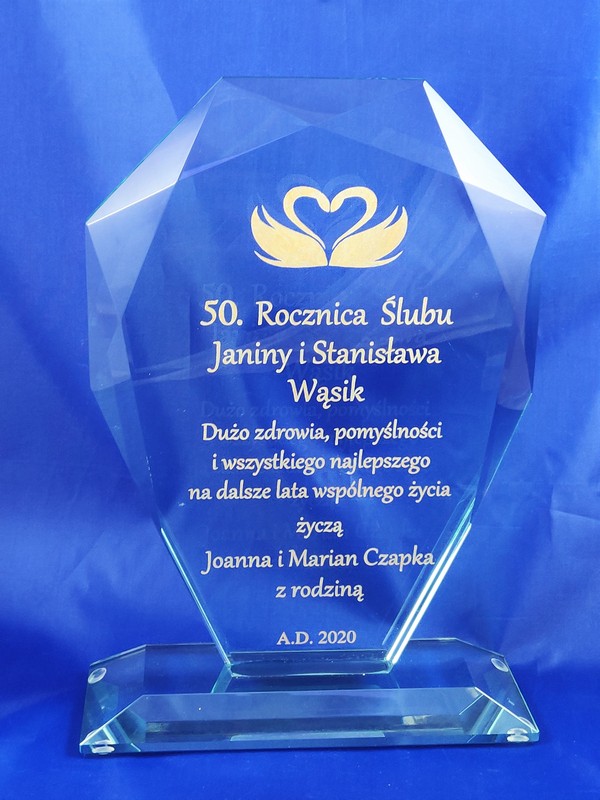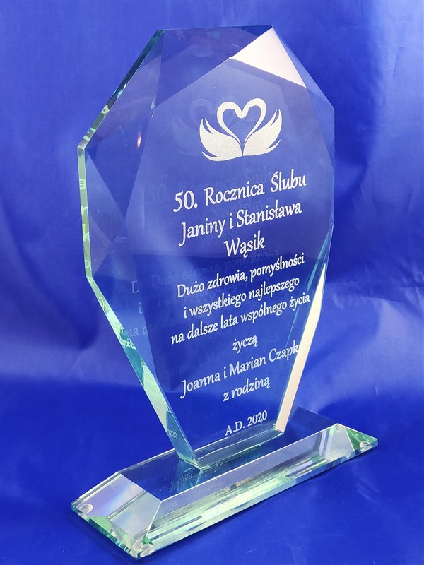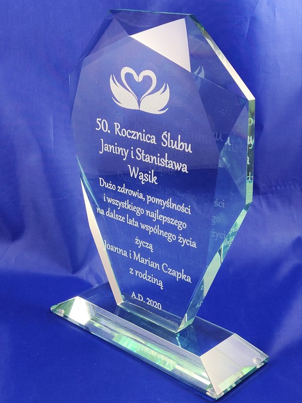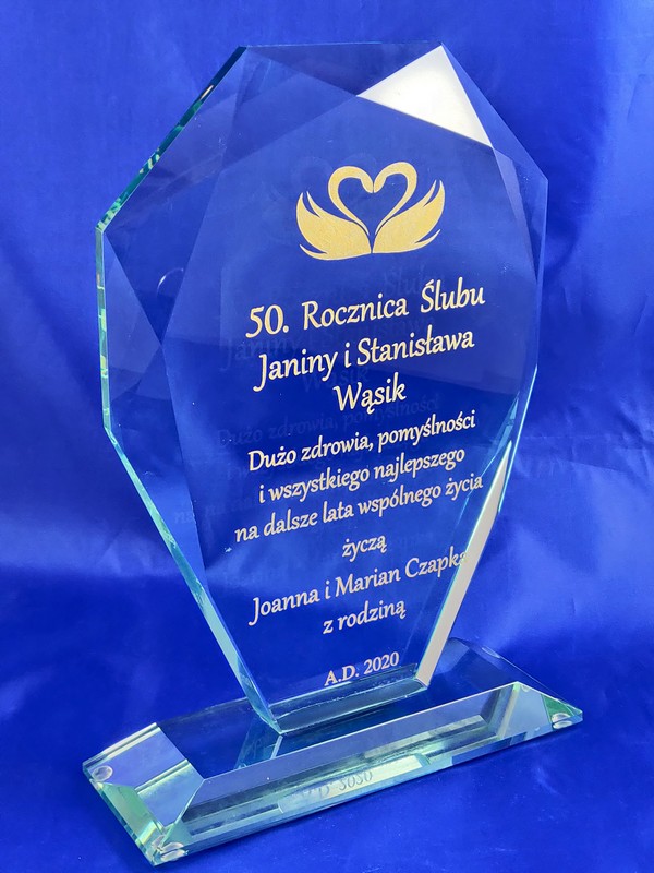 Prezentowana pamiątka dedykowana jest z okazji rocznicy ślubu, ale można wykonać ją także na inne okazje.Grawer z okazji rocznicy ślubu można wykonać także na innych modelach statuetek szklanych.