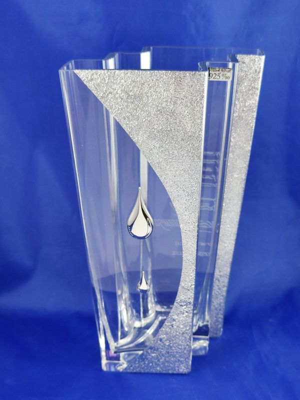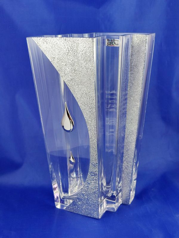 Dodatkowo w centralnej części wazonu umieszczone są srebrne błyszczące krople.