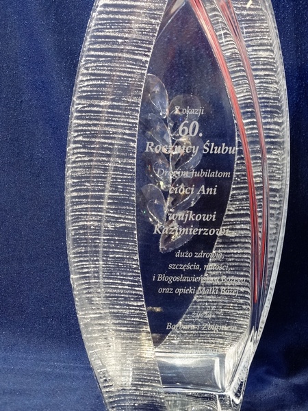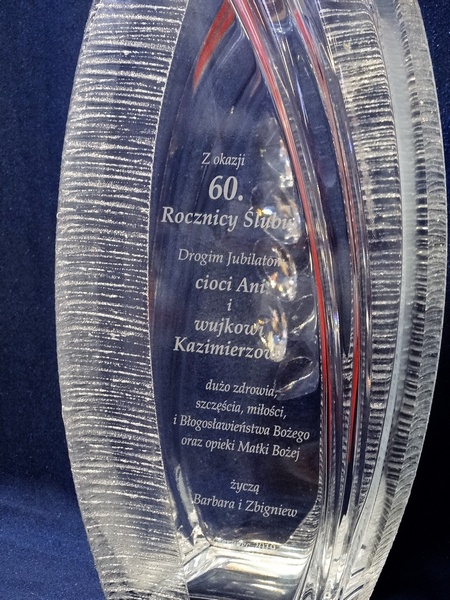 Na wazonie wykonany jest grawer ozdobnych grafik i dedykacji z okazji Rocznicy Ślubu.