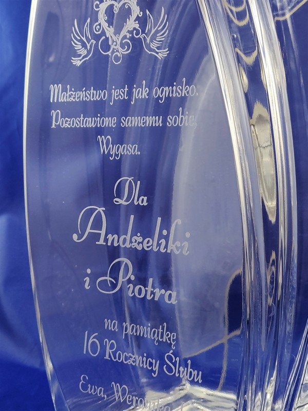 Na wazonie wykonany jest grawer ozdobnych grafik i dedykacji na pamiątkę uroczystości rocznicy ślubu.