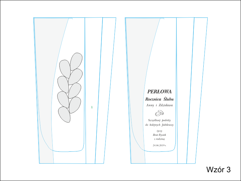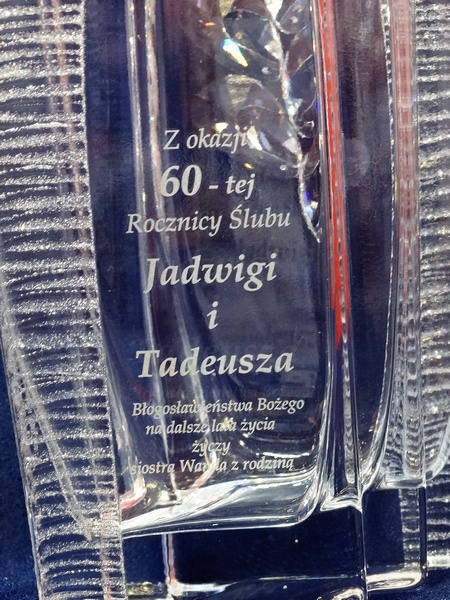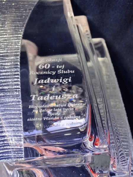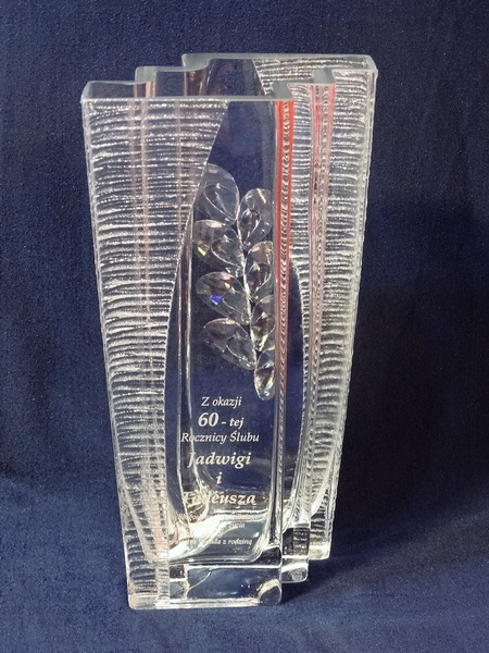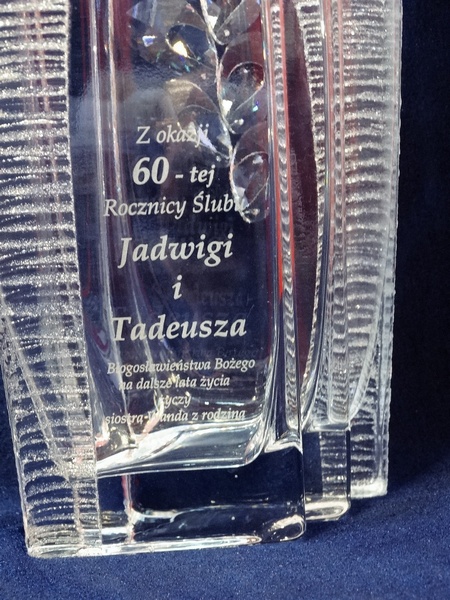 Na wazonie wykonany jest grawer ozdobnych grafik i dedykacji z okazji jubileuszu rocznicy ślubu.