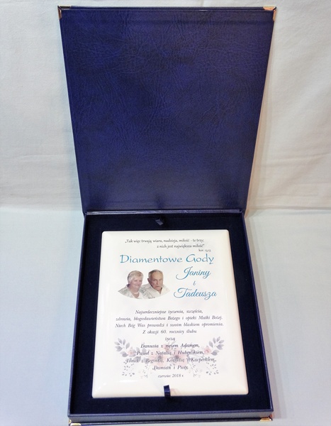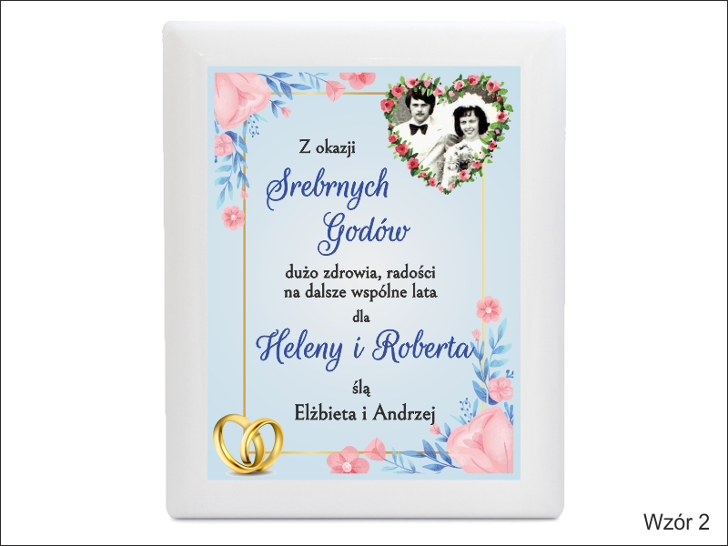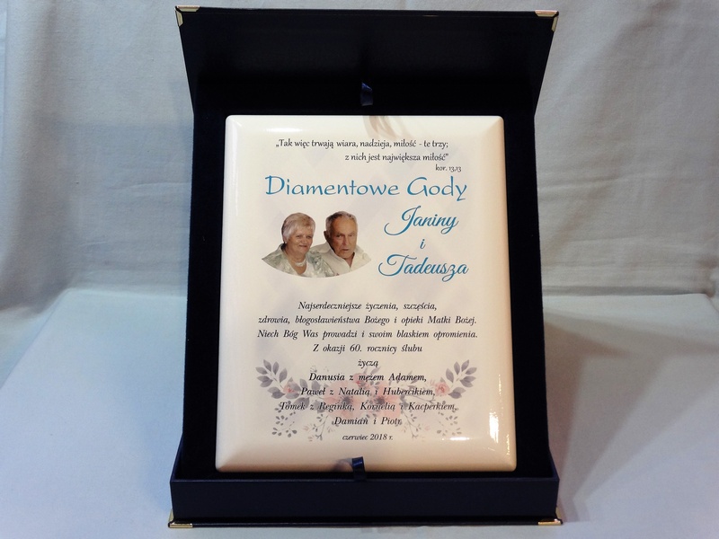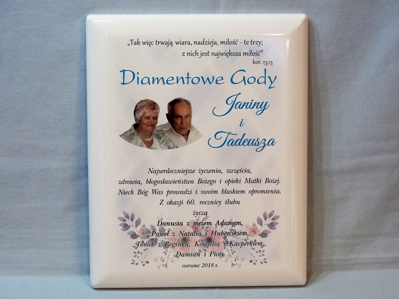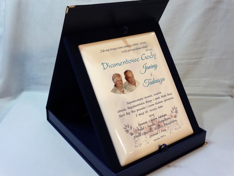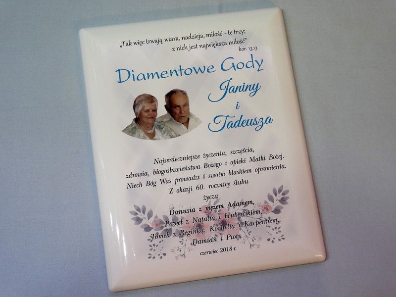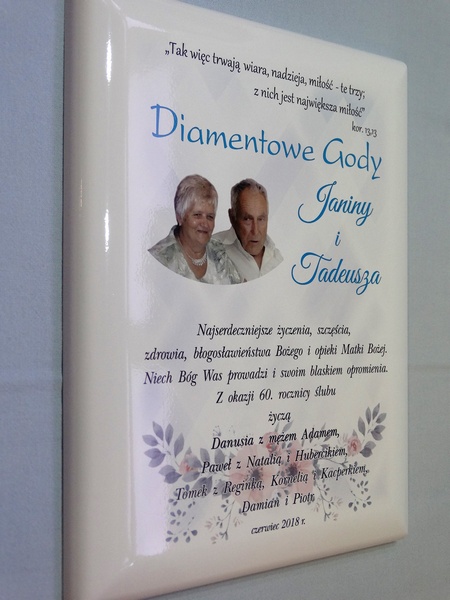 Dedykacja, grafiki, ozdobniki czy zdjęcie nadrukowane są na blasze lub bezpośrednio na białym, drewnianym podkładzie.