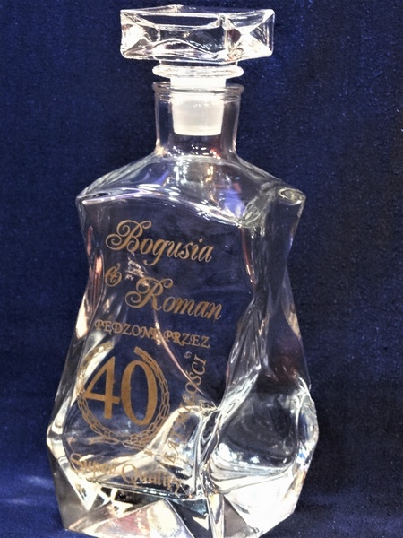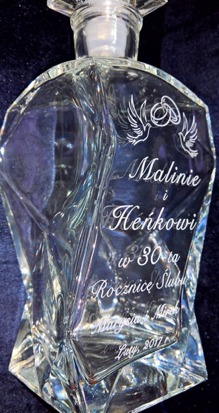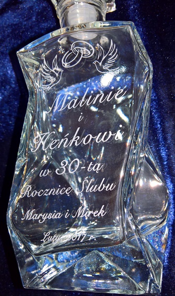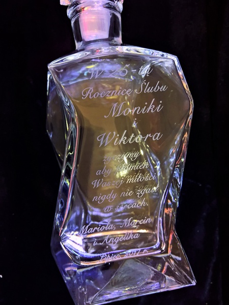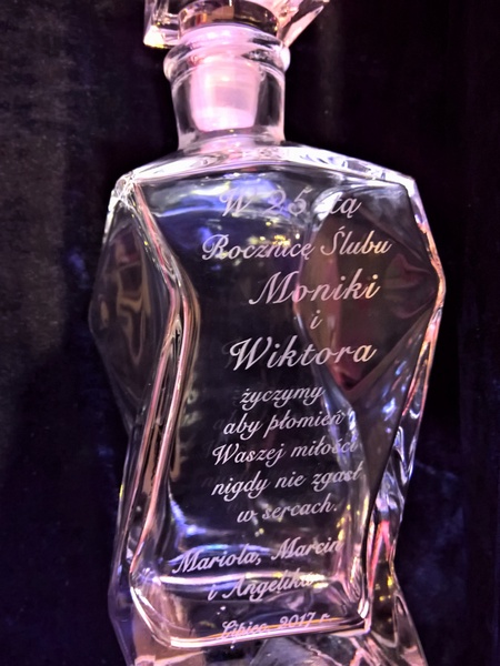 Prezent w postaci karafki łamanej z grawerem okolicznościowej dedykacji i ozdobnych grafik z okazji Rocznicy Ślubu.
