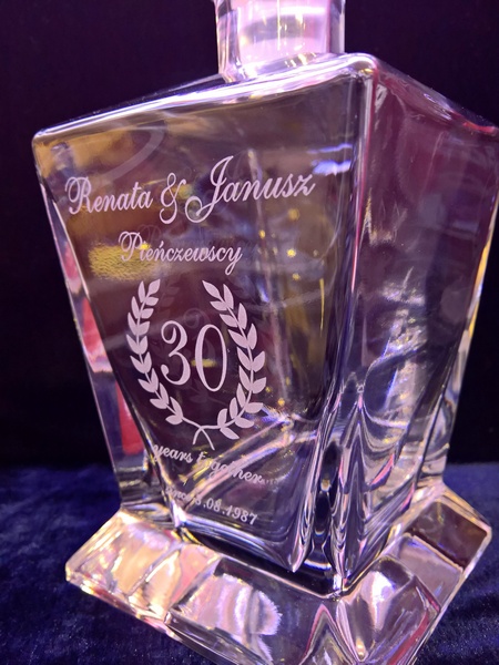 Prezent z okazji Rocznicy Ślubu w postaci karafki Krosno Caro "Kapliczka" z grawerem dedykacji i ozdobnych grafik.