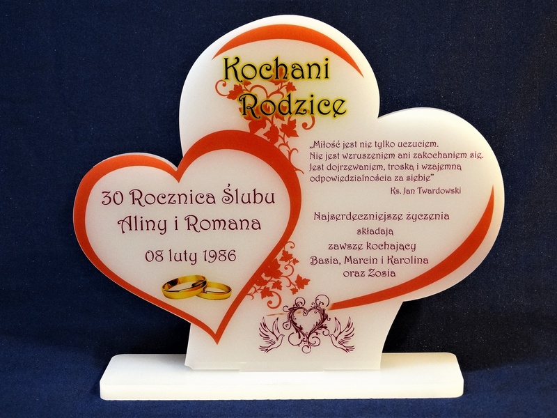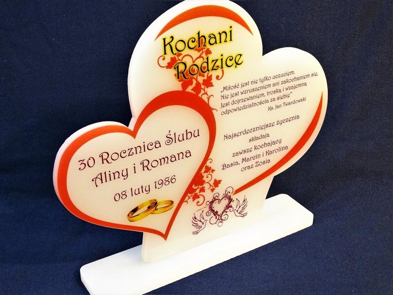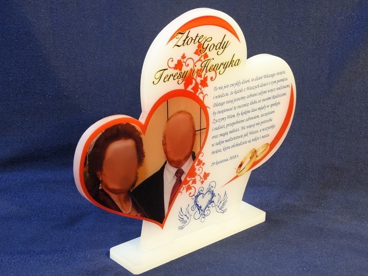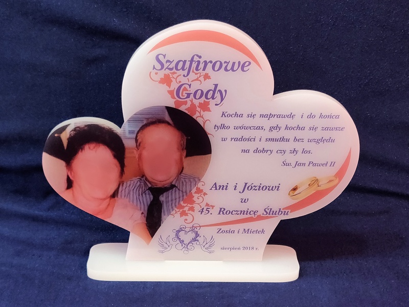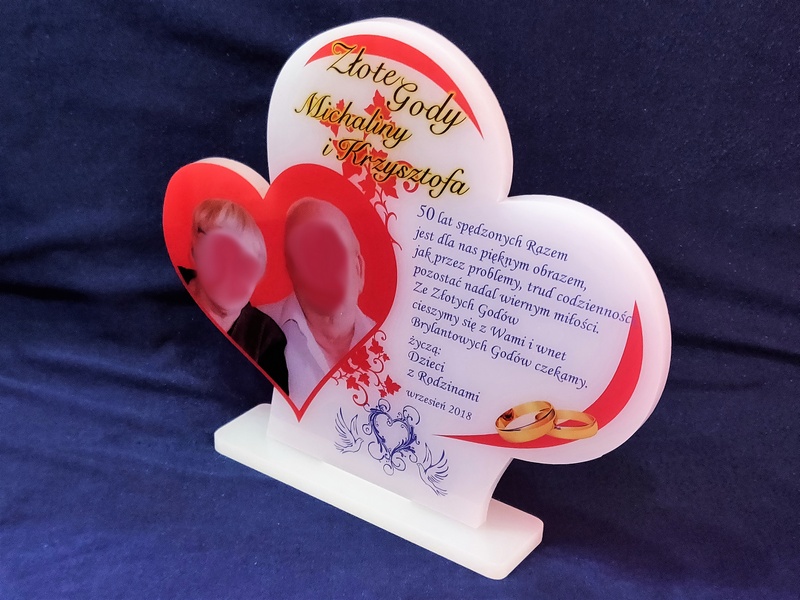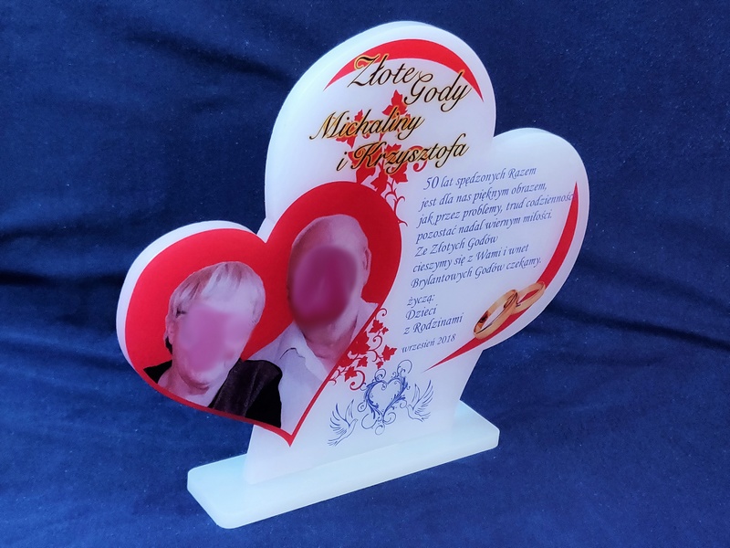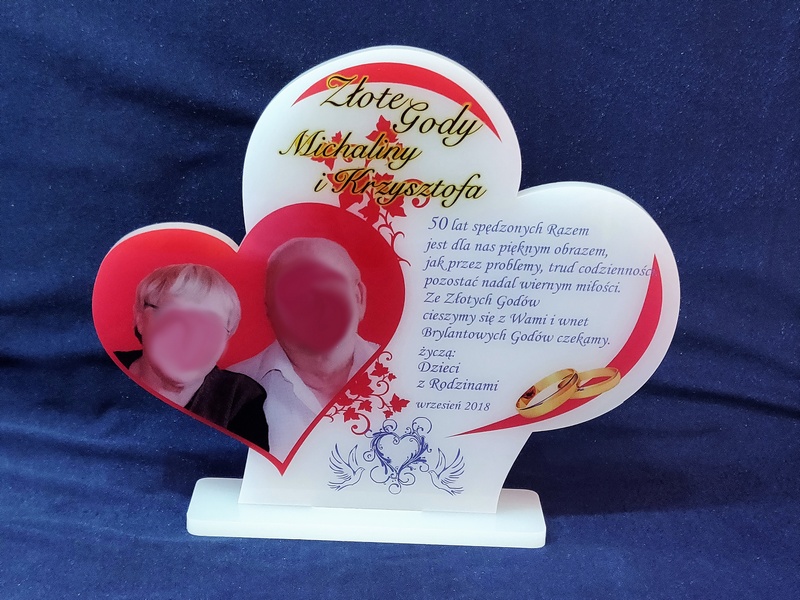 Statuetka z pleksi nadrukiem dedykacji, ozdobnych grafik i zdjęć na pamiątkę Rocznicy Ślubu w kształcie połączonych serc.