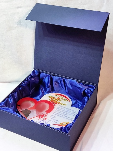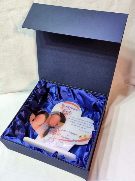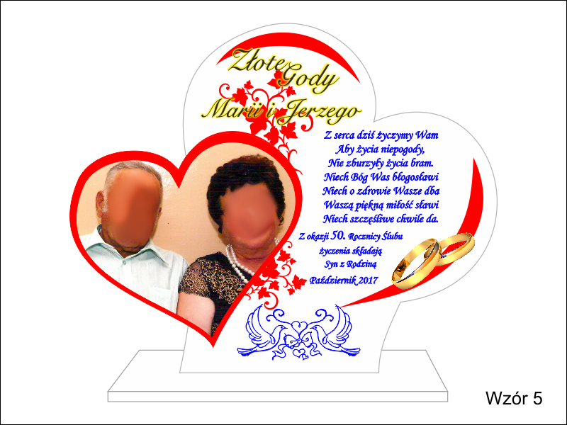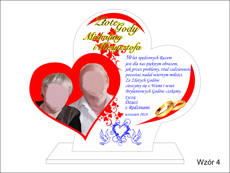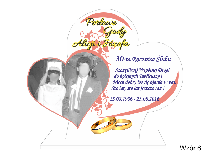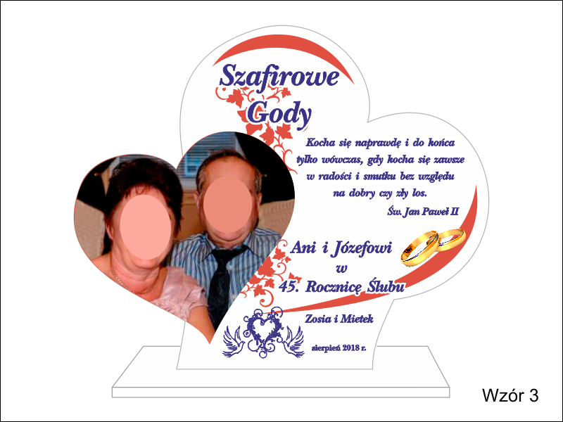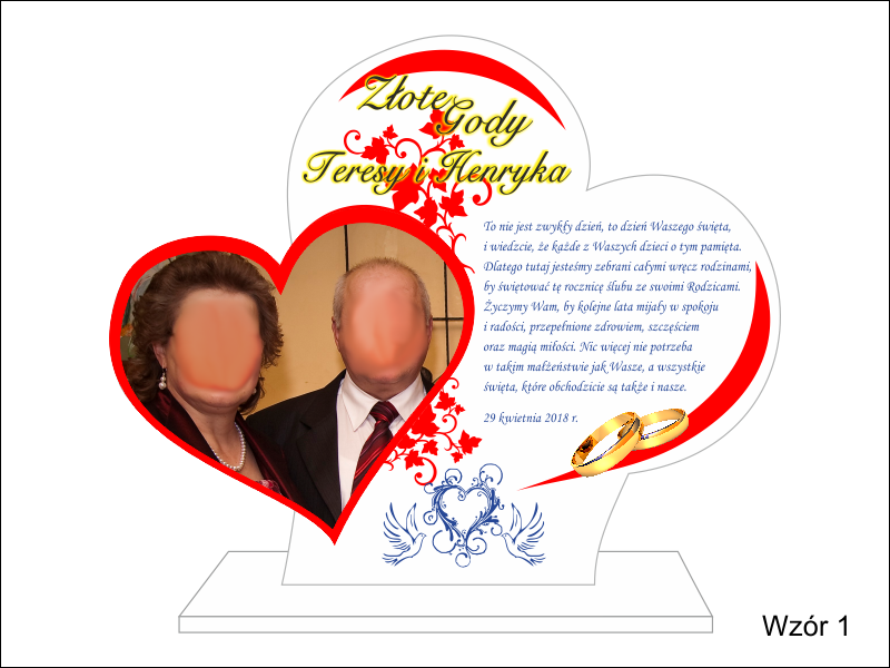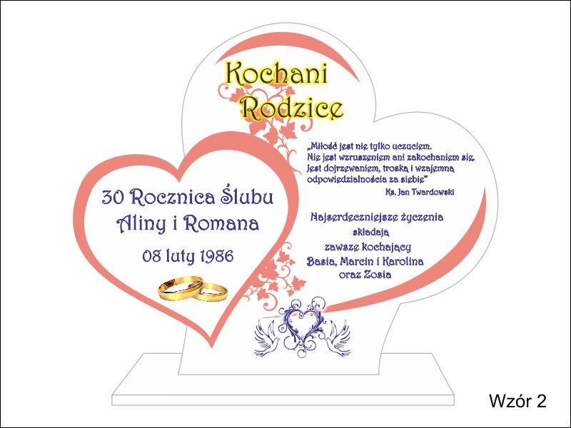 Statuetka z pleksi nadrukiem dedykacji, ozdobnych grafik i zdjęć na pamiątkę Rocznicy Ślubu w kształcie połączonych serc.