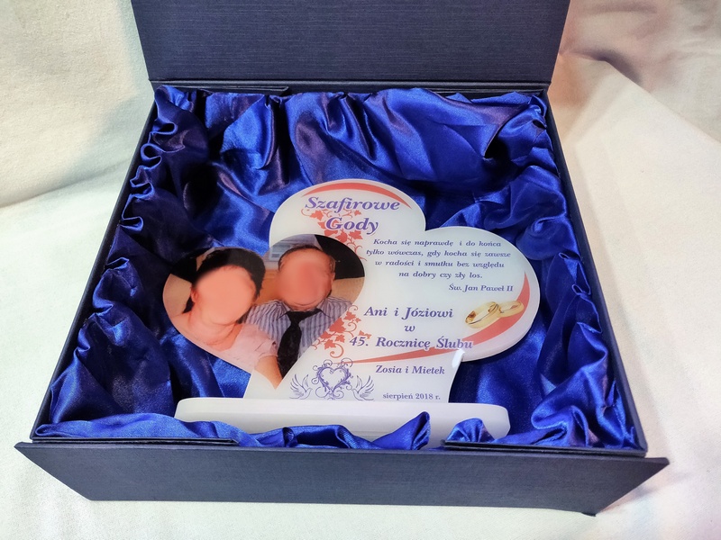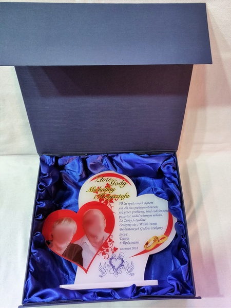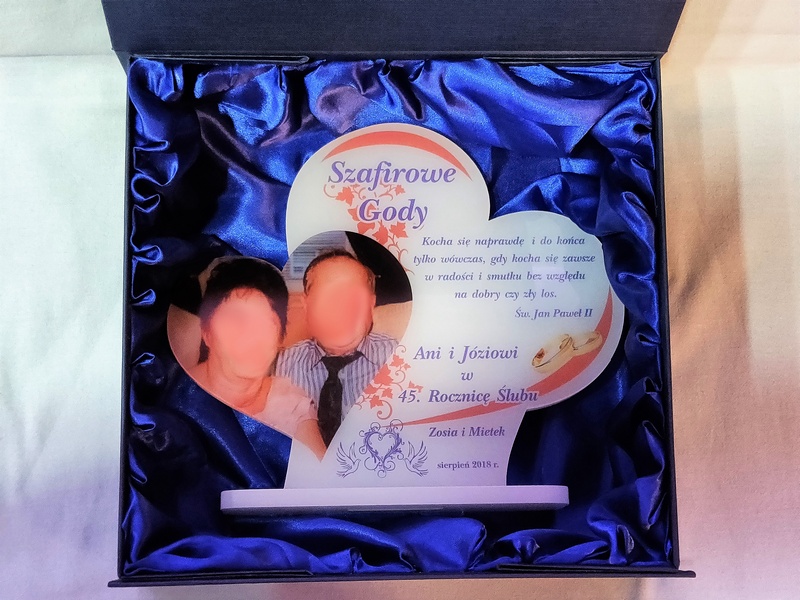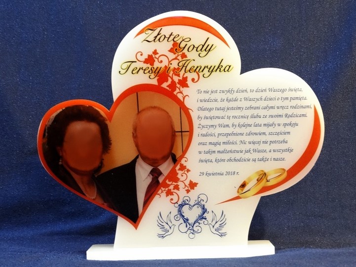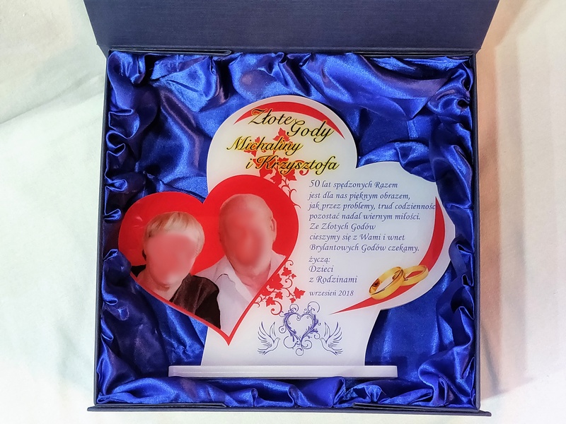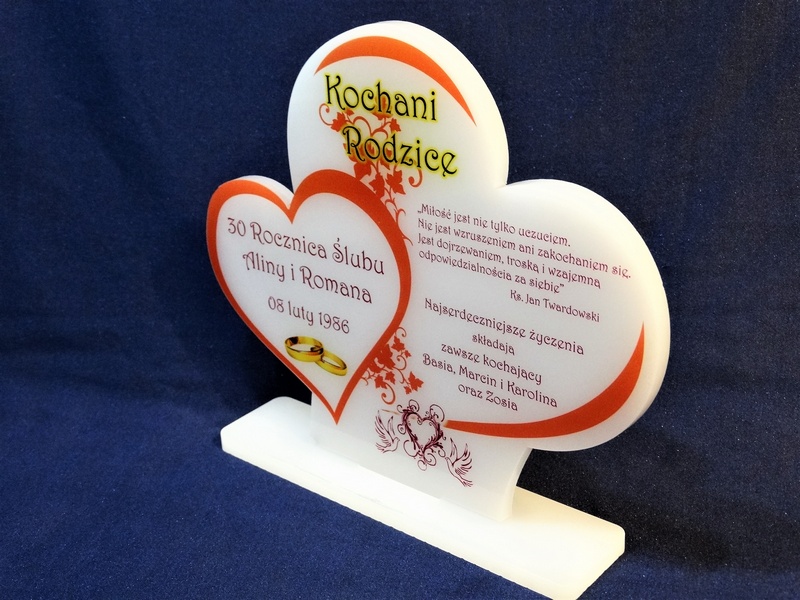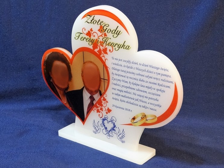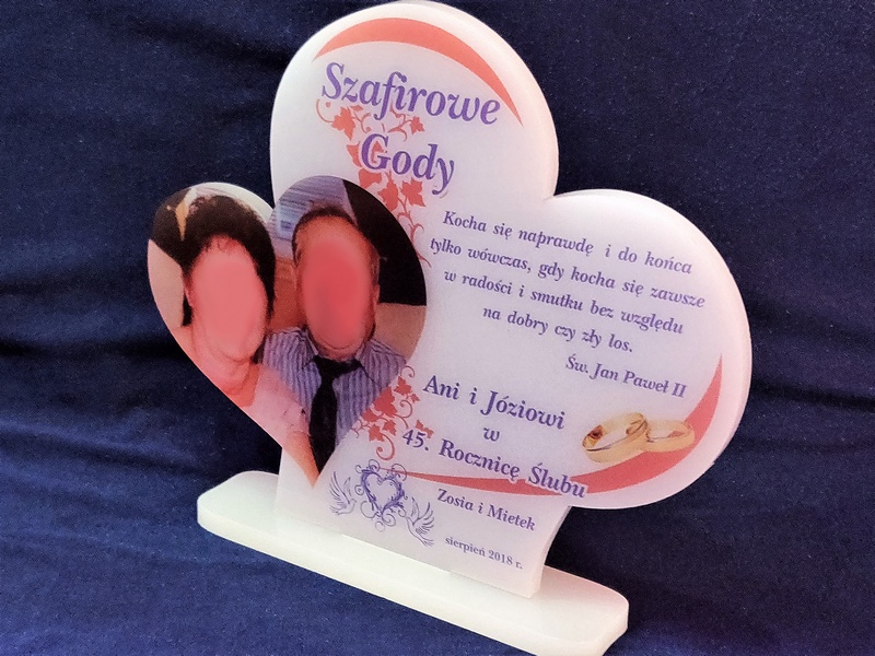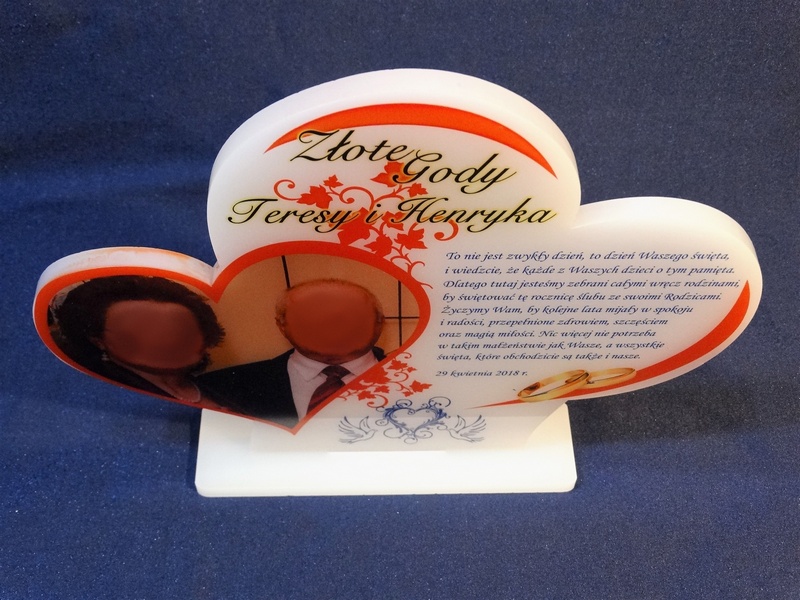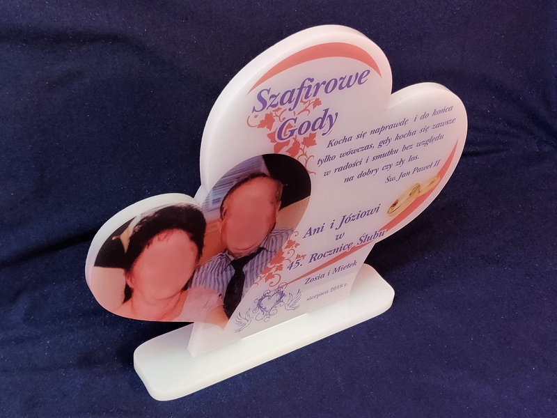 Na pleksie wykonany jest bezpośredni nadruk dedykacji, ozdobnych grafik czy zdjęcia Jubilatów.