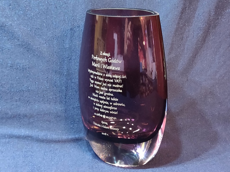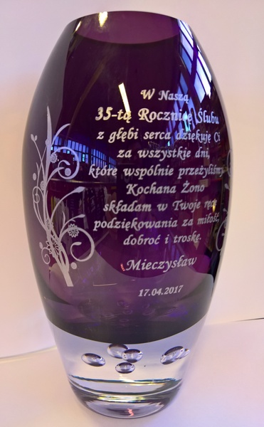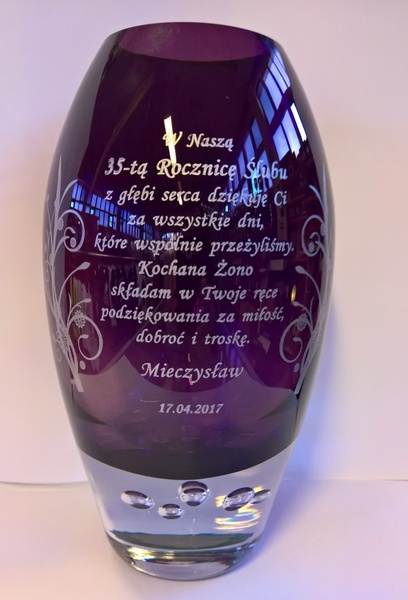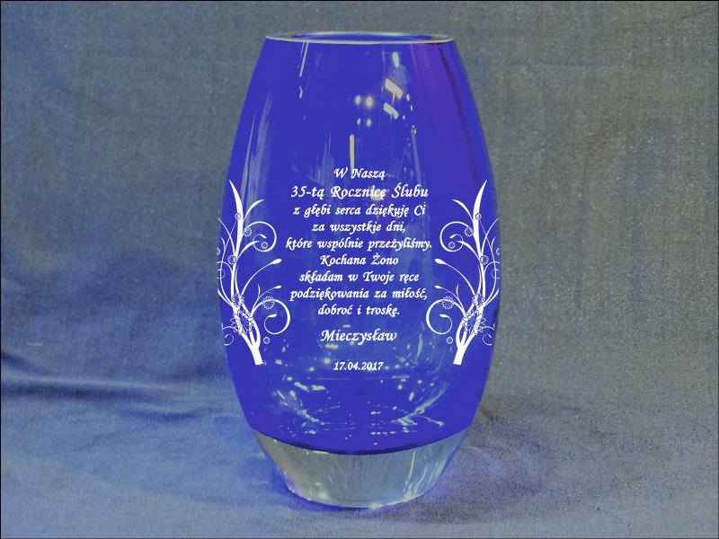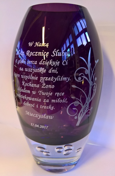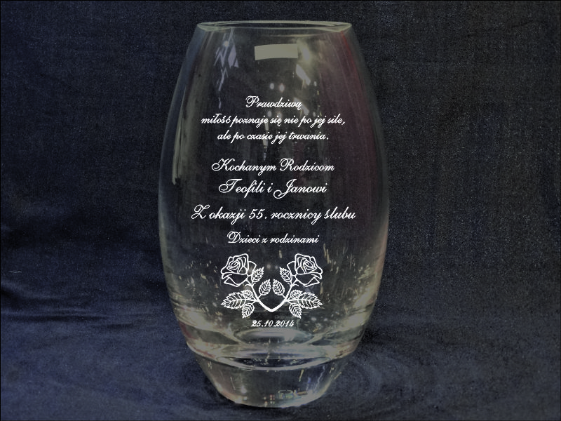 Na wazonie wykonany jest grawer ozdobników i dedykacji z okazji Rocznicy Ślubu.