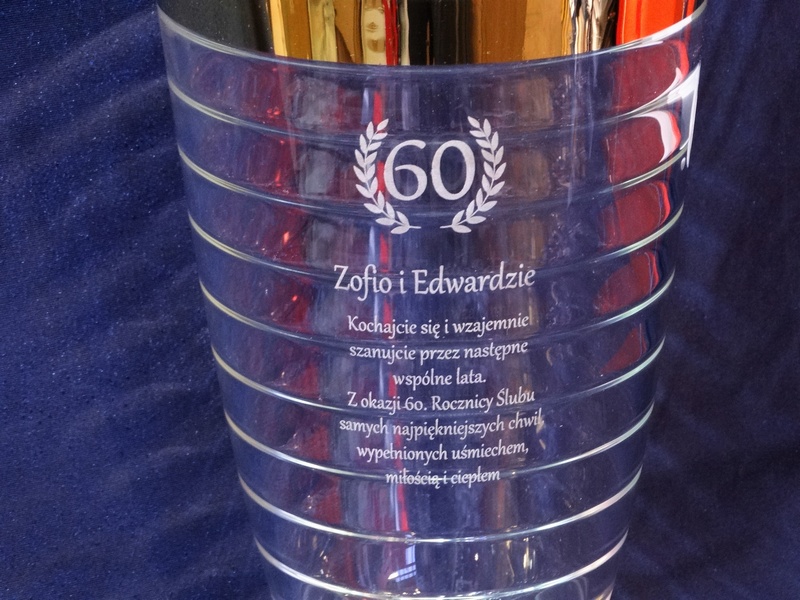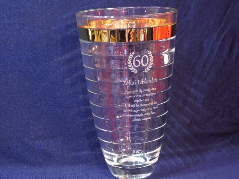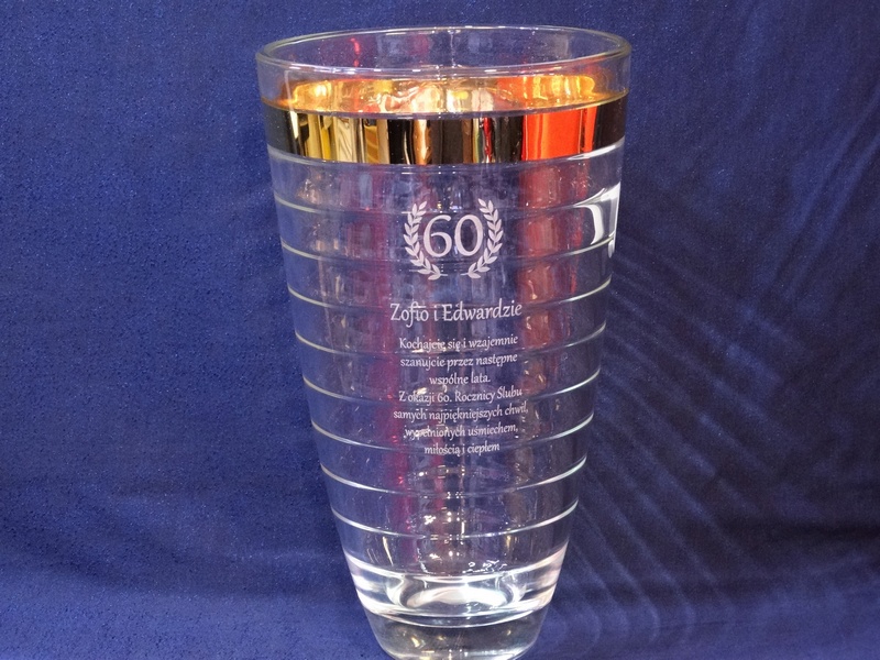 Na wazonie wykonany jest grawer ozdobników i dedykacji z okazji Rocznicy Ślubu.