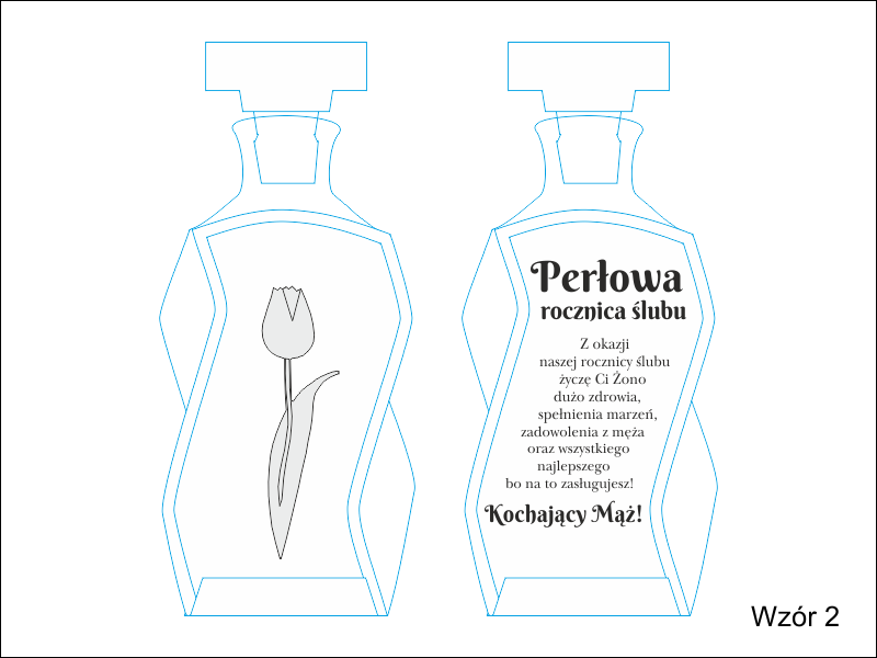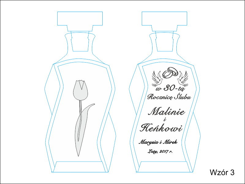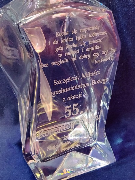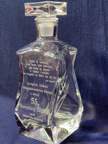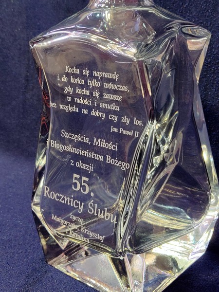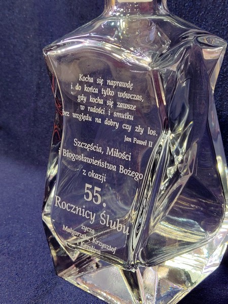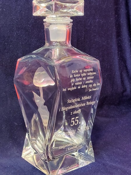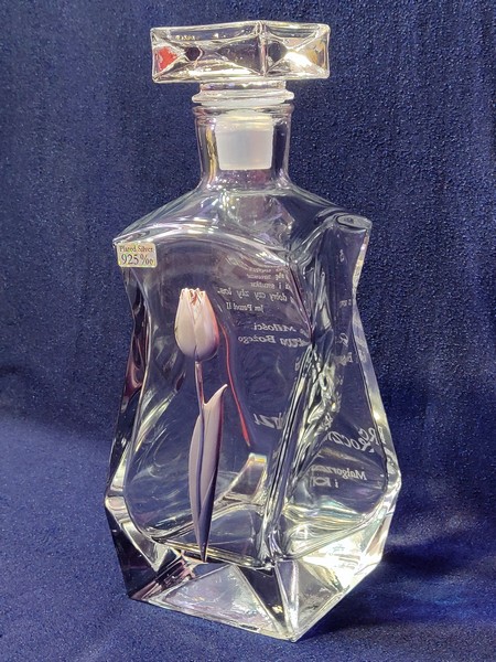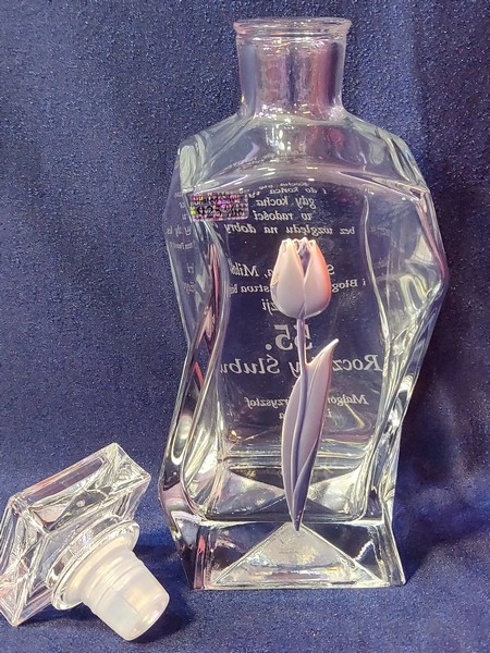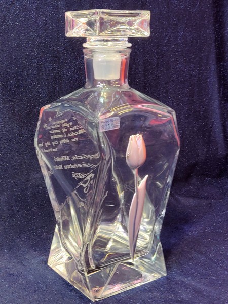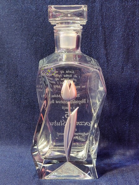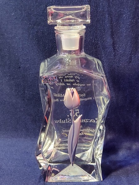 Pamiątkowy prezent na Rocznicę Ślubu w postaci zdobionej tulipanem karafki łamanej z grawerem dedykacji i ozdobnych grafik.