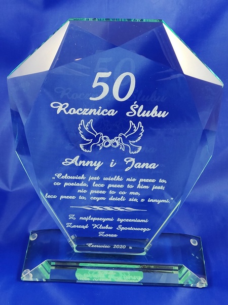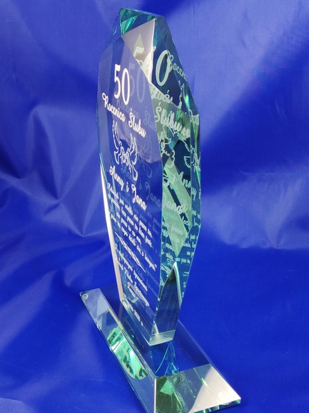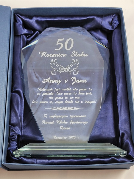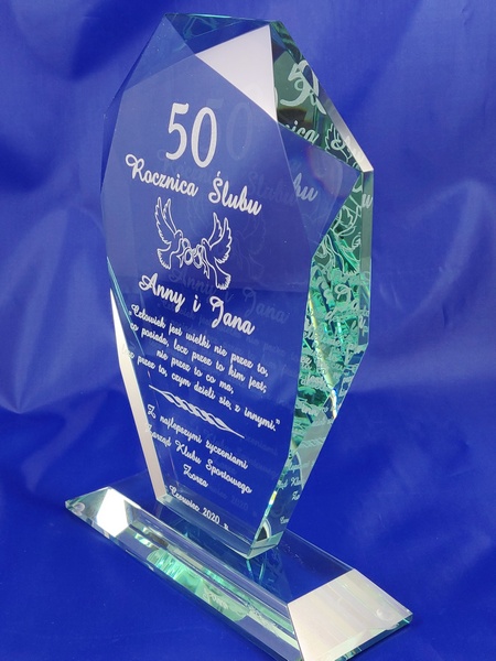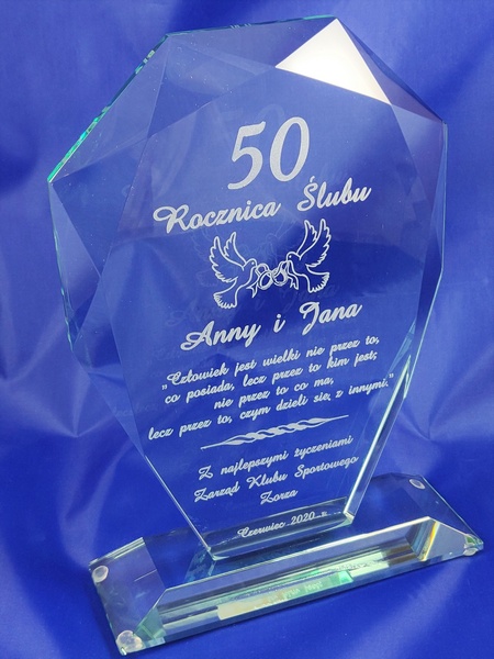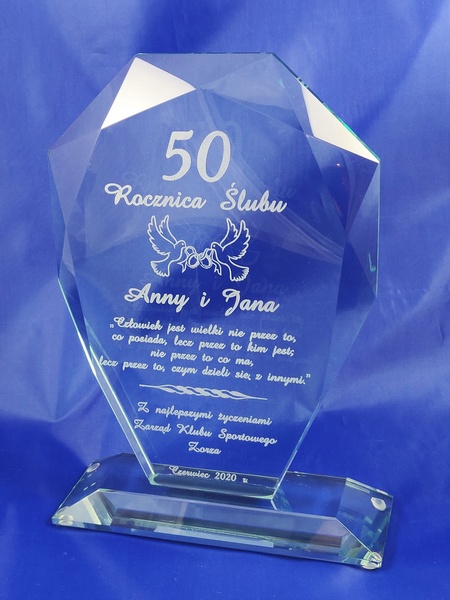 Prezentowana statuetka dedykowana jest z okazji rocznicy ślubu, ale można wykonać ją także na inne okazje.Grawer z okazji rocznicy ślubu można wykonać także na innych modelach statuetek szklanych.
