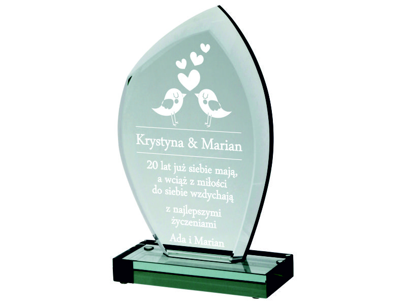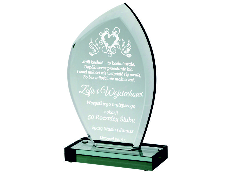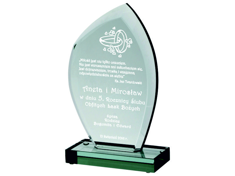 Pamiątkę z grawerem na rocznicę ślubu można także wykonać na innych modelach statuetek szklanych.