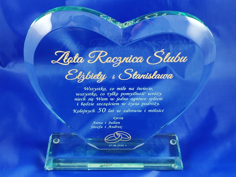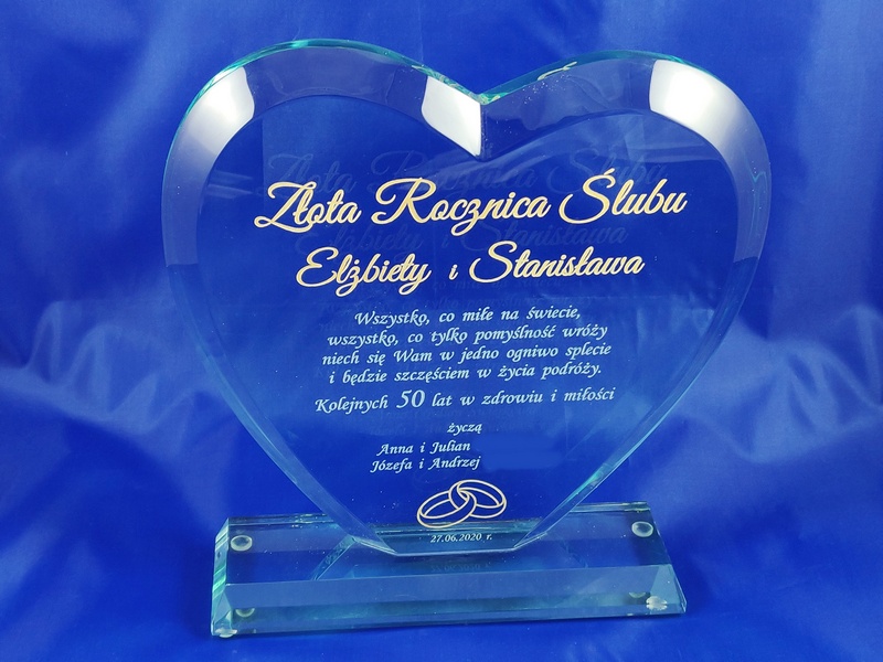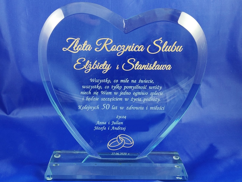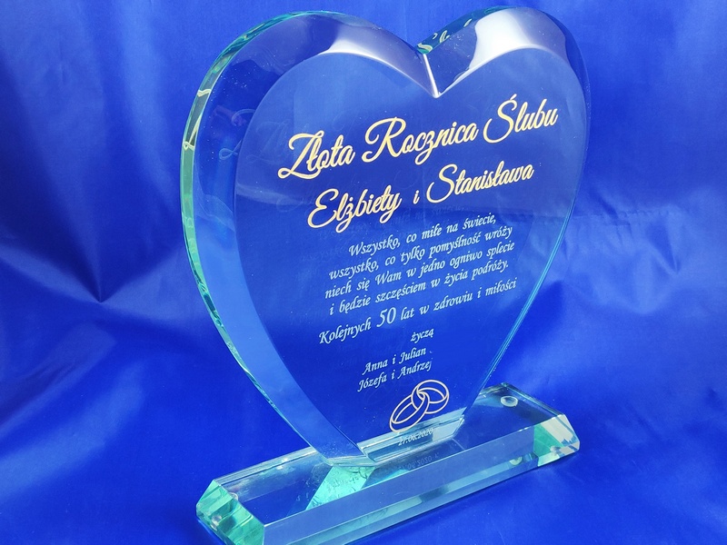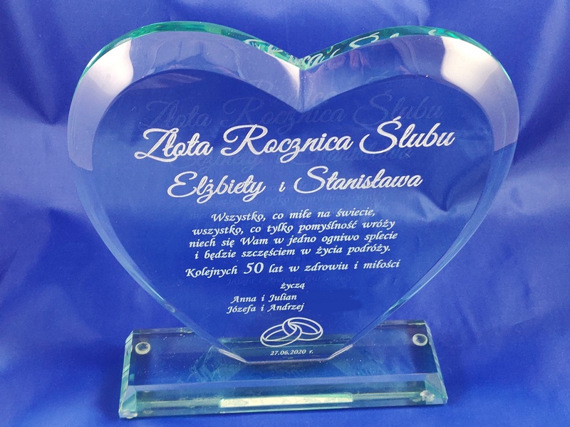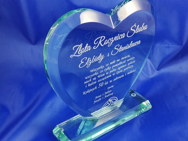 Pamiątka na Rocznicę Ślubu w postaci szklanej statuetki w kształcie serca z grawerem okolicznościowej dedykacji.