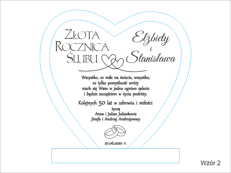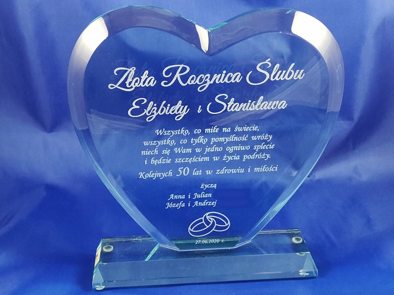 Na szkle wykonany jest grawer ozdobnych grafik oraz okolicznościowej dedykacji na pamiątkę uroczystości Jubileuszu Ślubu.