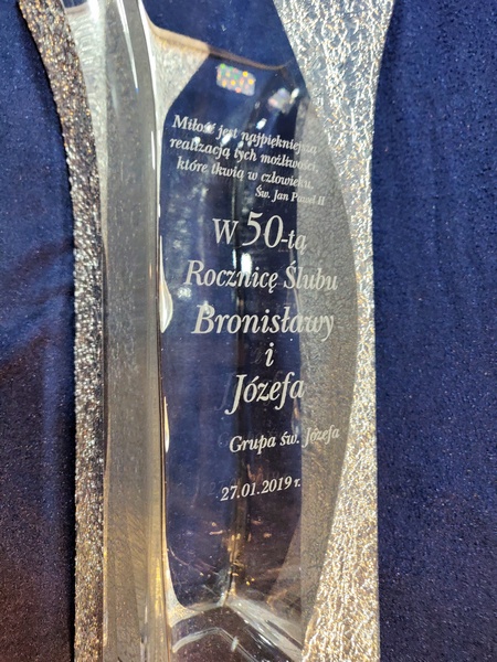 Na wazonie wykonany jest grawer ozdobników i dedykacji na pamiątkę Rocznicy Ślubu.