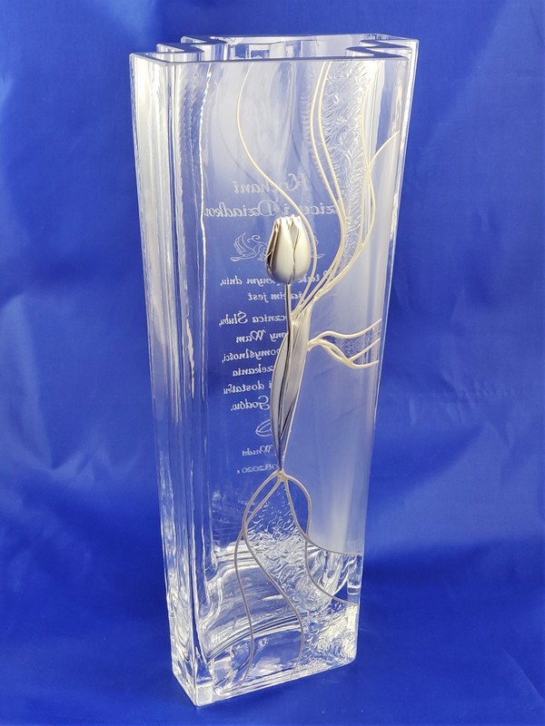 Pamiątka z okazji Rocznicy Ślubu w postaci wazonu szklanego Verona z grawerem dedykacji, ozdobionego srebrnym tulipanem.