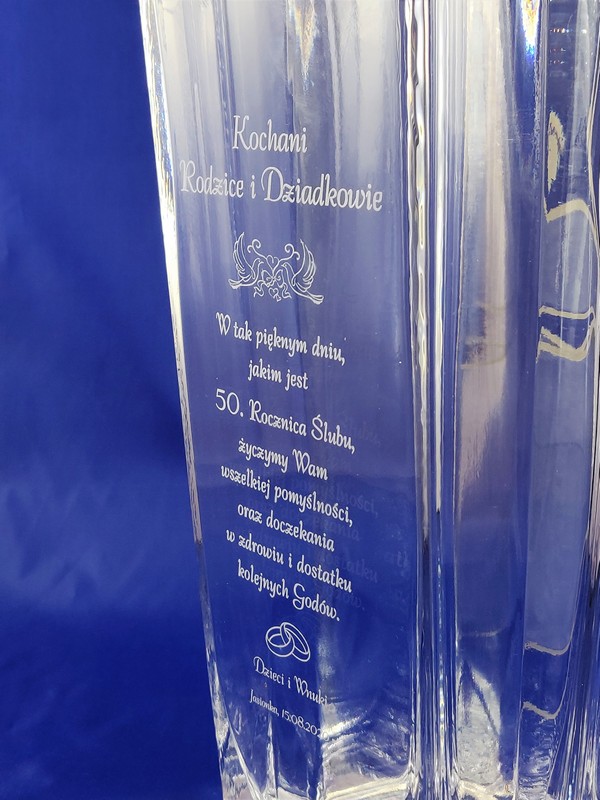 Na wazonie wykonany jest grawer ozdobnych grafik i dedykacji na pamiatkę Rocznicy Ślubu.