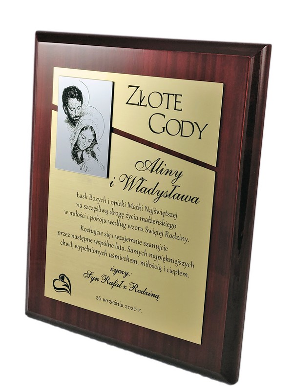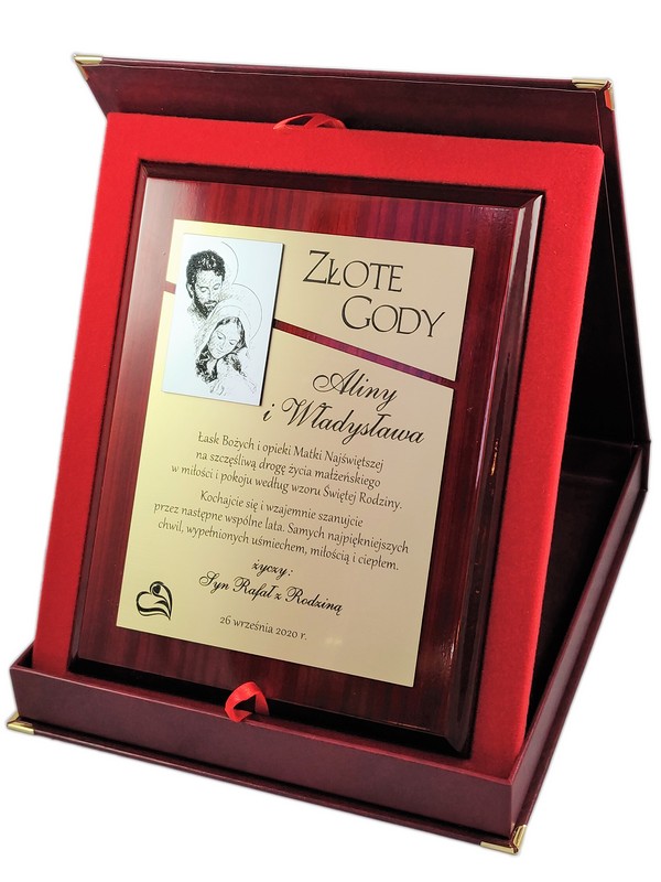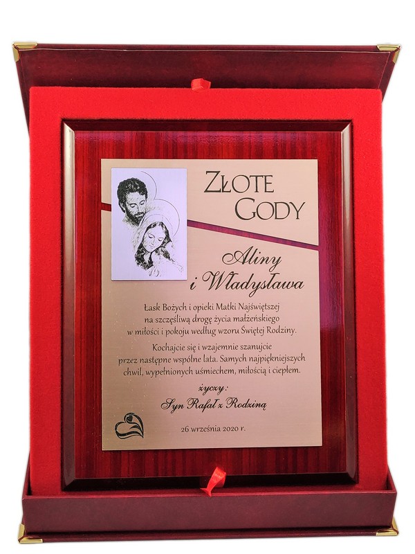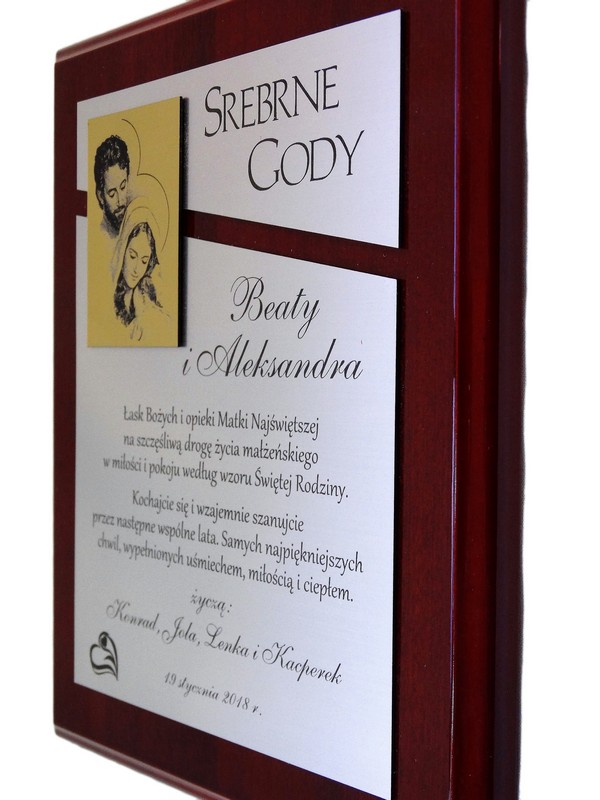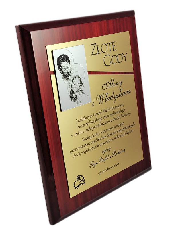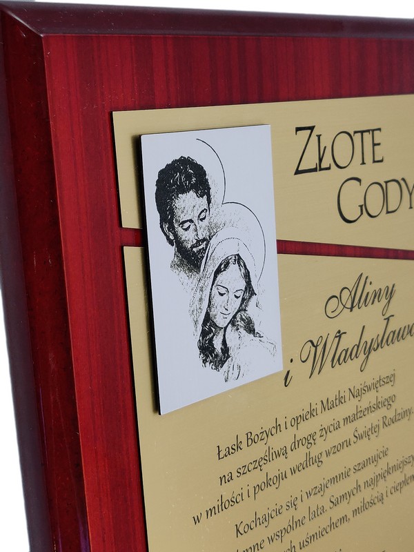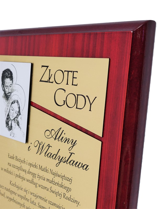 Upominek z okazji rocznicy ślubu w postaci grawerowanego dyplomu drewnianego z wizerunkiem Świętej Rodziny.