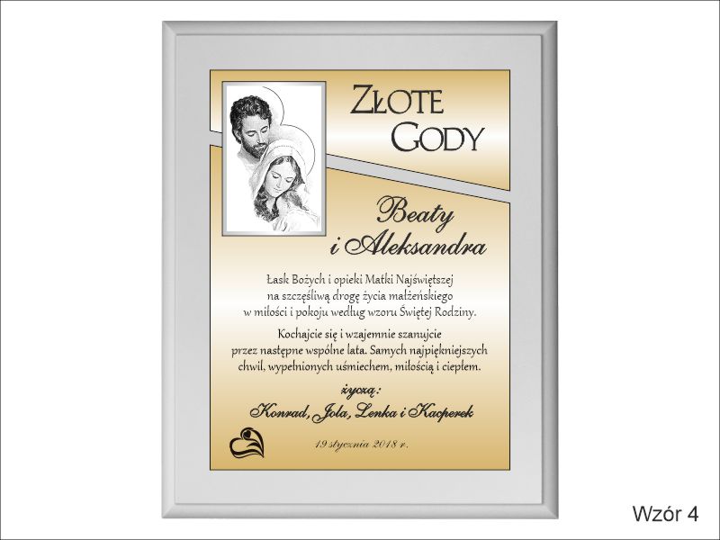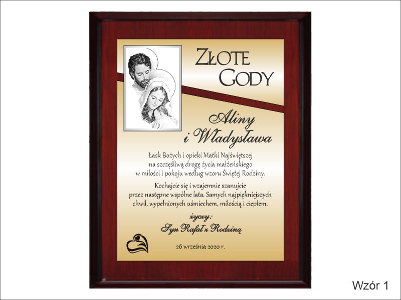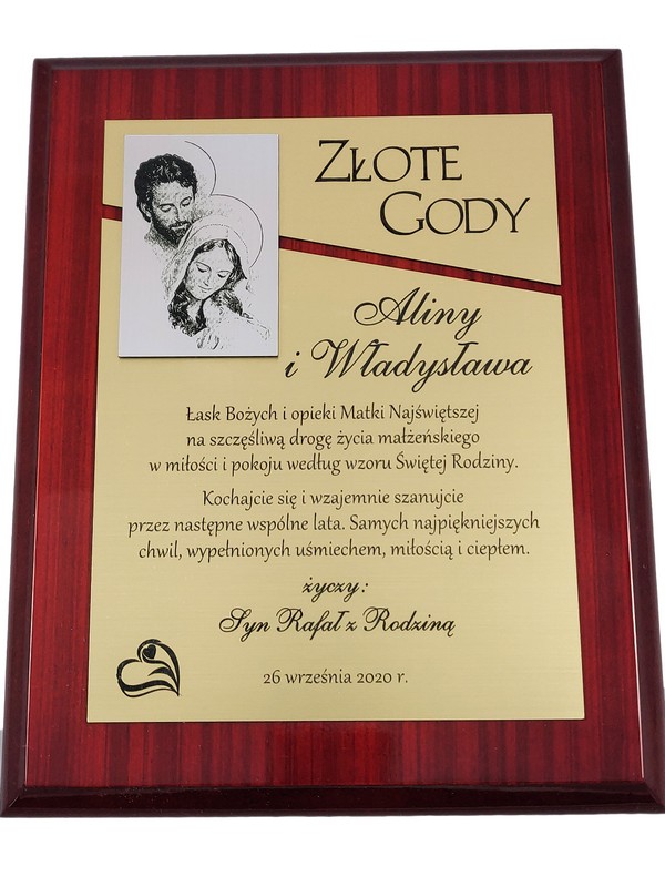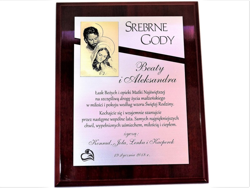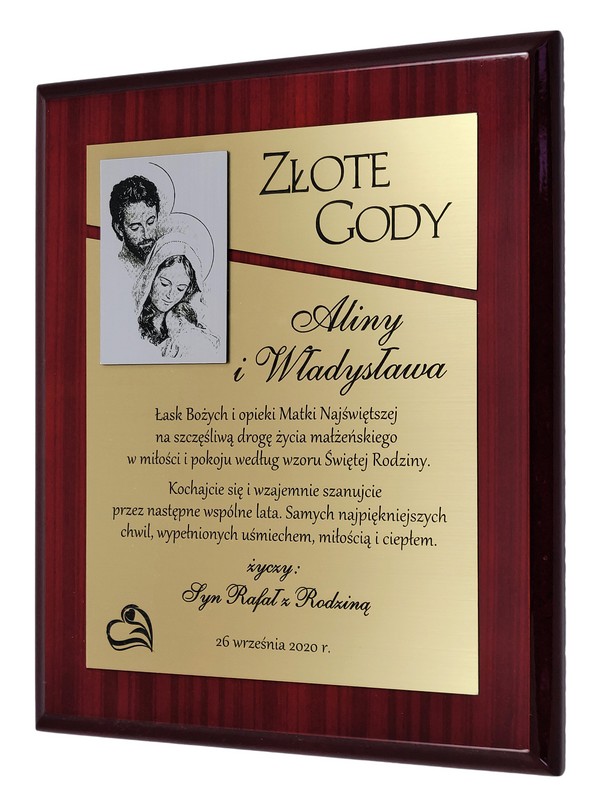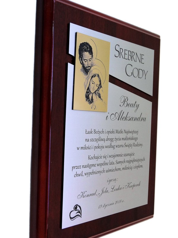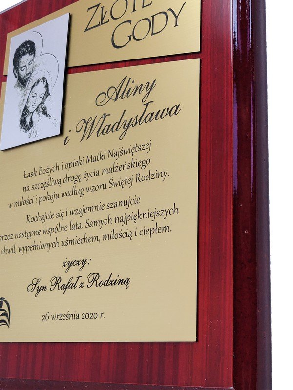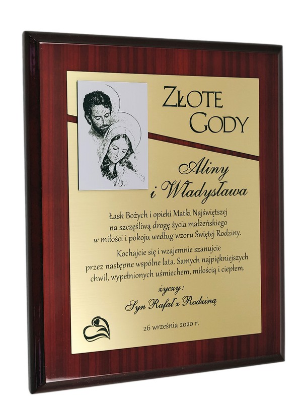 Upominek z okazji rocznicy ślubu w postaci grawerowanego dyplomu drewnianego z wizerunkiem Świętej Rodziny.