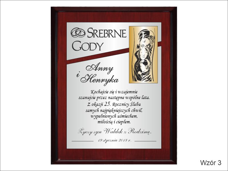Treść dedykacji, grafiki, zdjęcie czy ozdobniki wykonane są z laminatów grawerskich lub blachy aluminiowej.