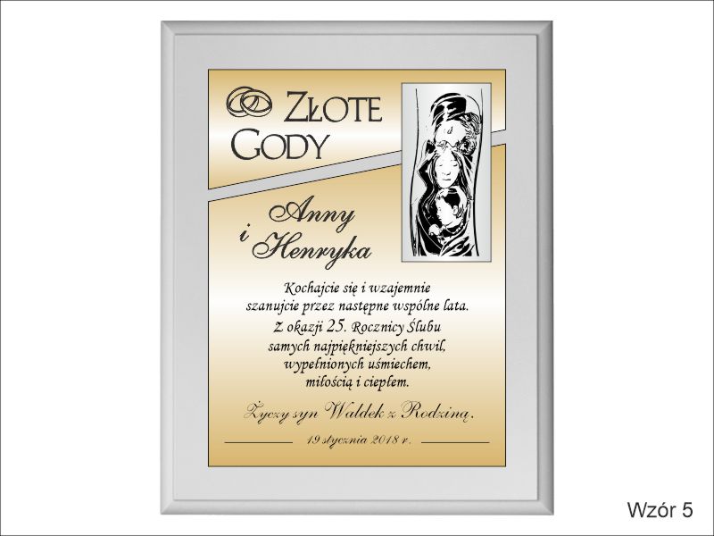 Pamiątkowy dyplom z okazji rocznicy ślubu wykonany jest na lakierowanym podkładzie.