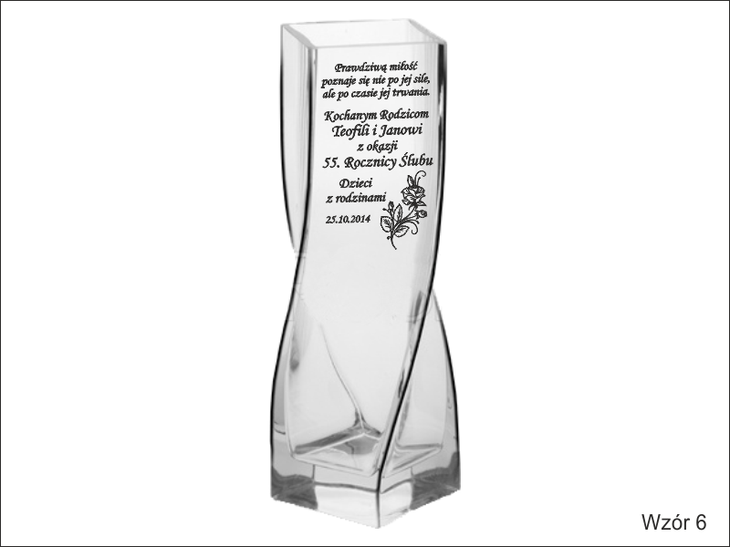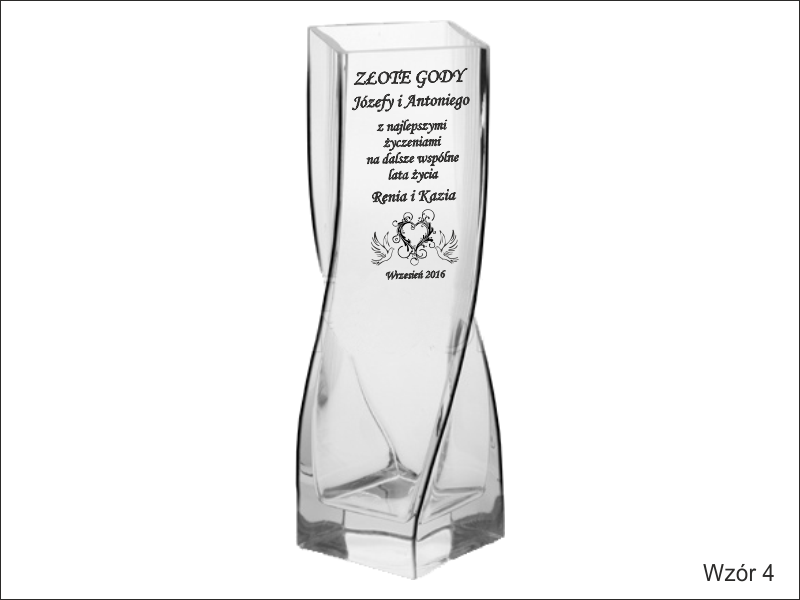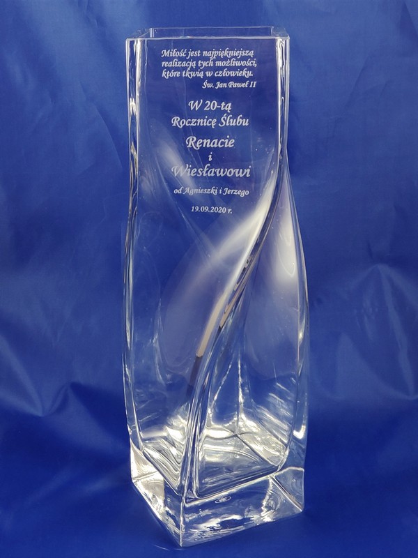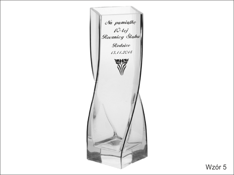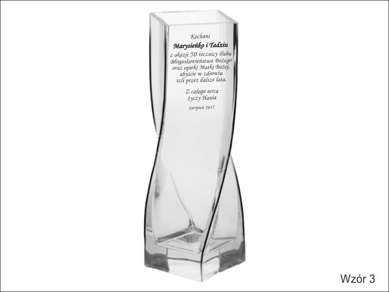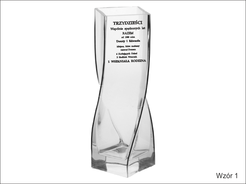 Upominek na pamiątkę jubileuszu Rocznicy Ślubu w formie skręcanego wazonu szklanego "Twister" z grawerem.