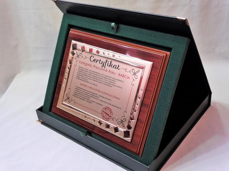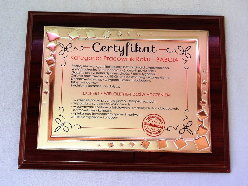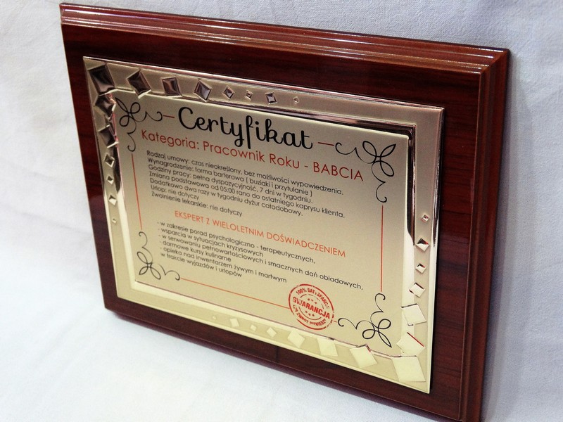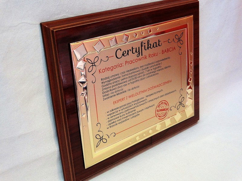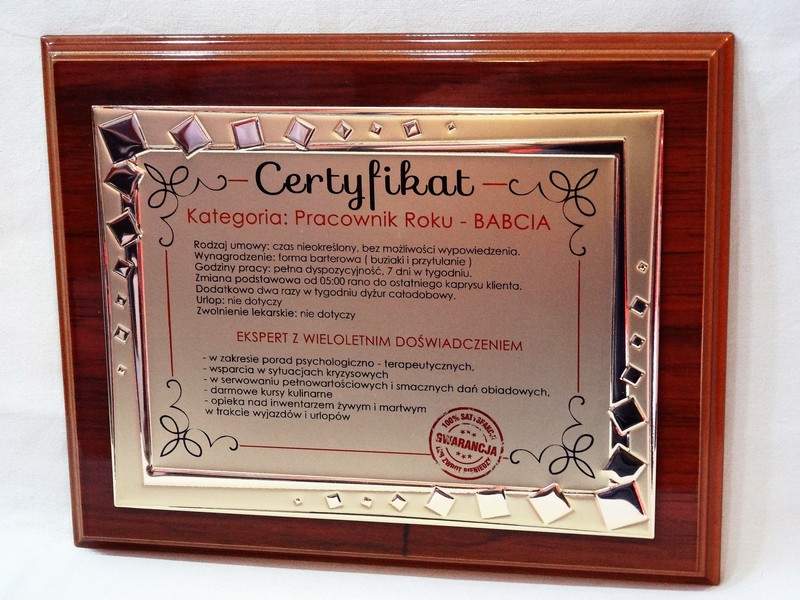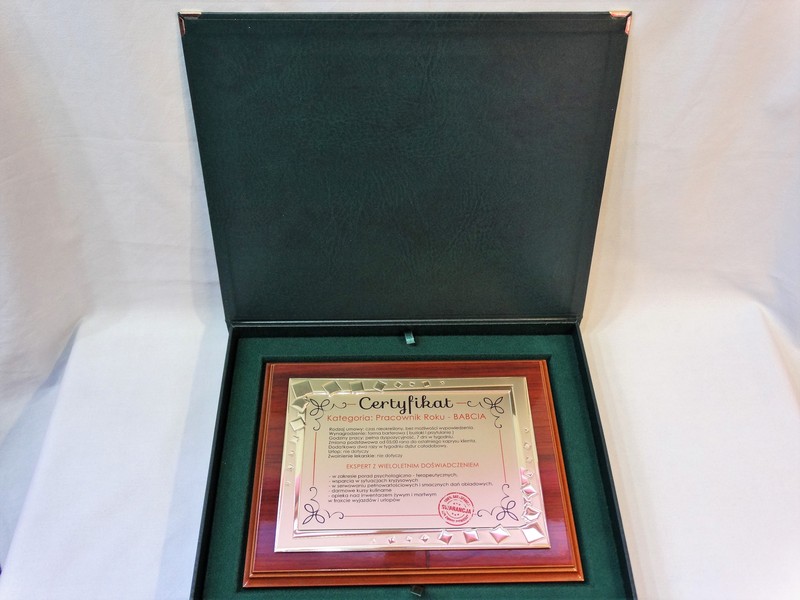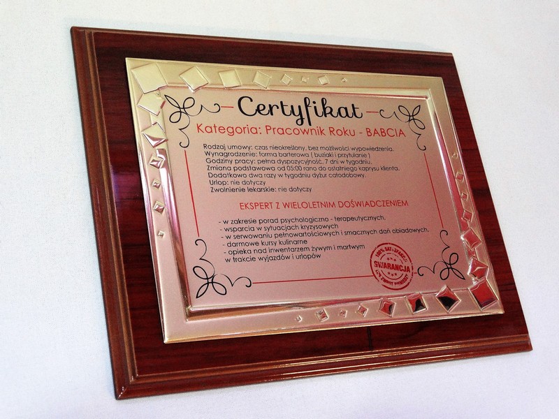 Certyfikat Babci i Certyfikat Dziadka - dyplom drewniany z paterą z nadrukiem