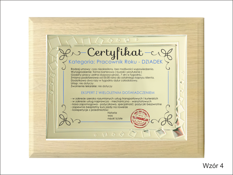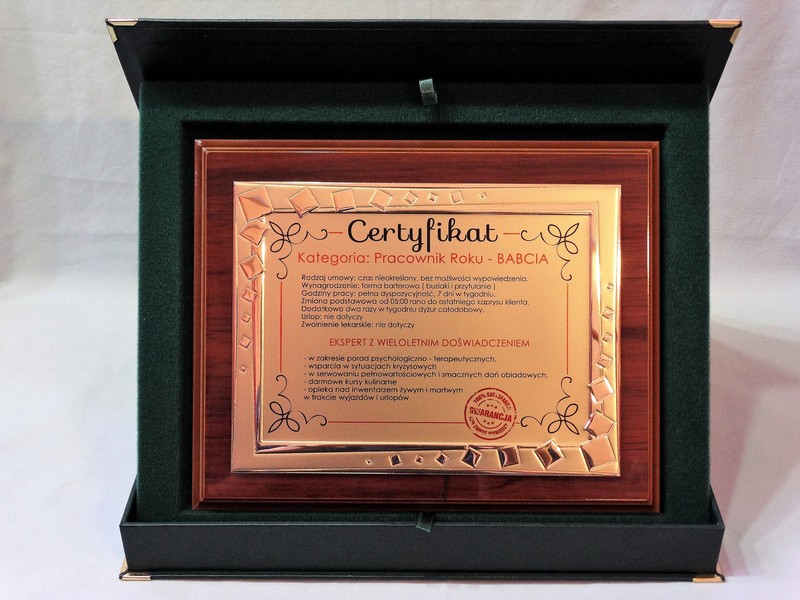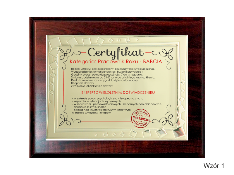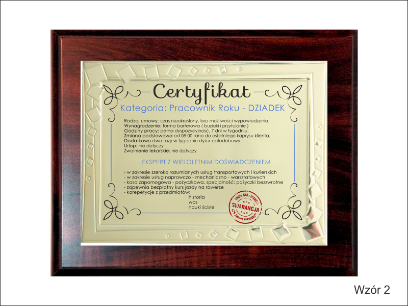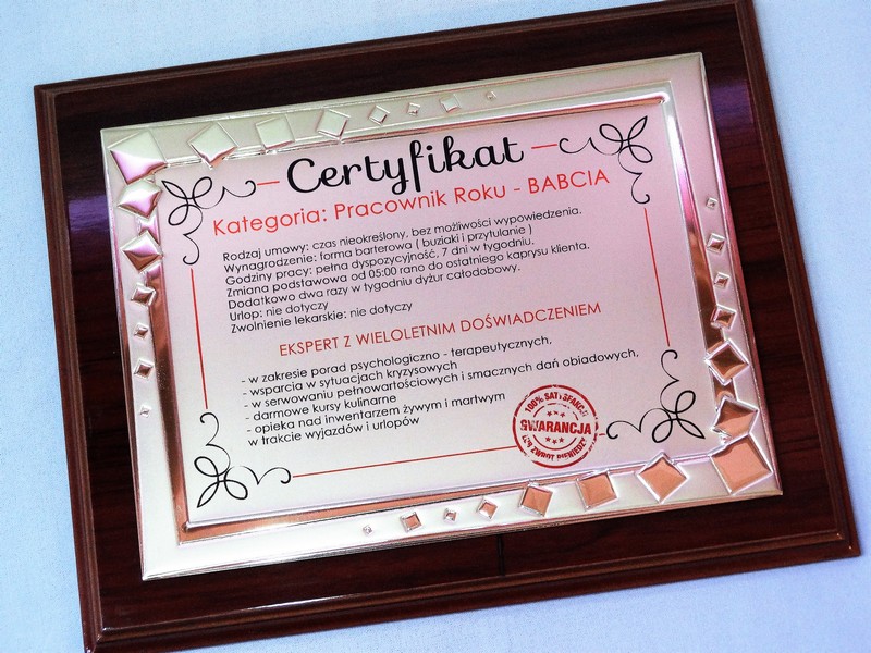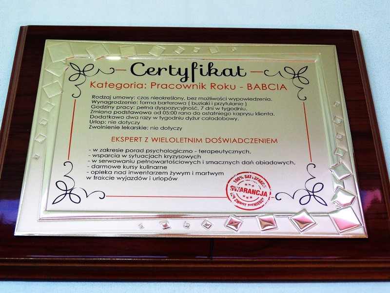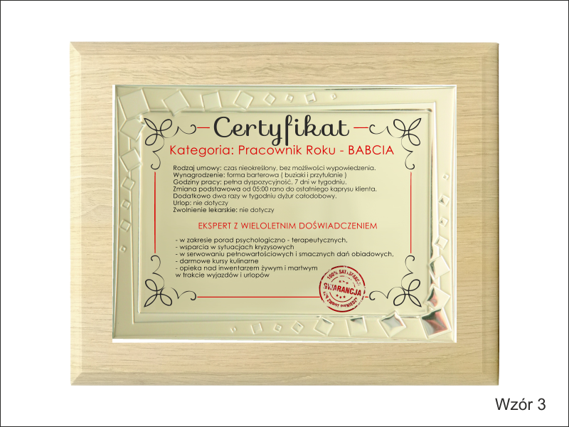 Certyfikat Babci i Certyfikat Dziadka - dyplom drewniany z paterą z nadrukiem
