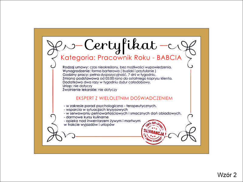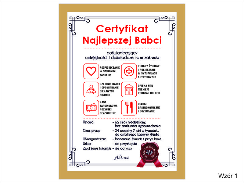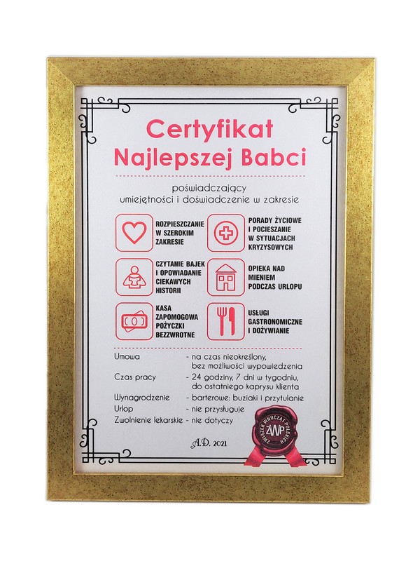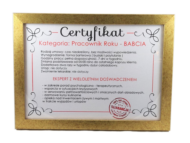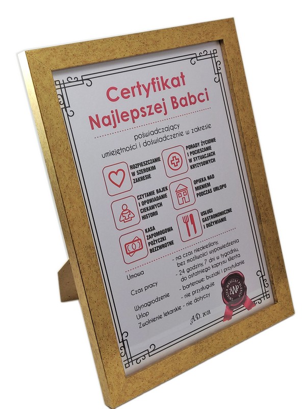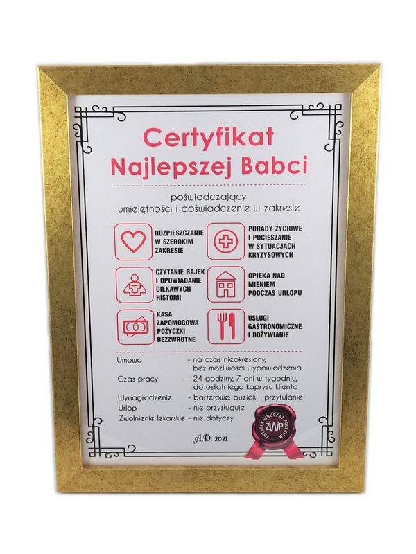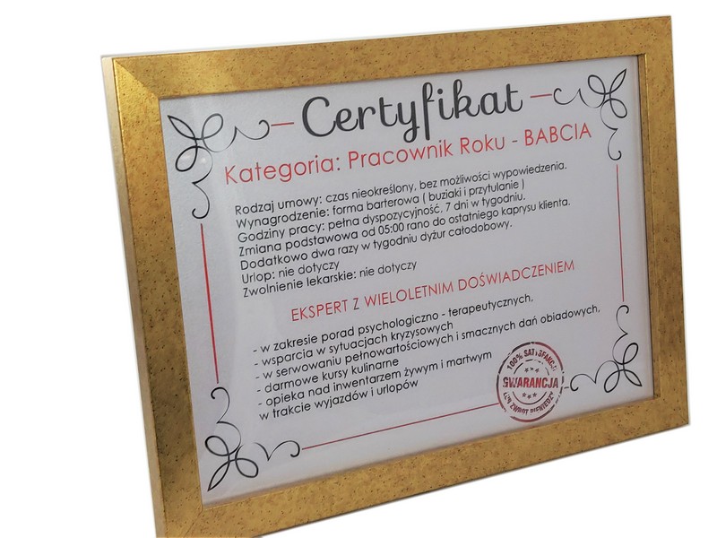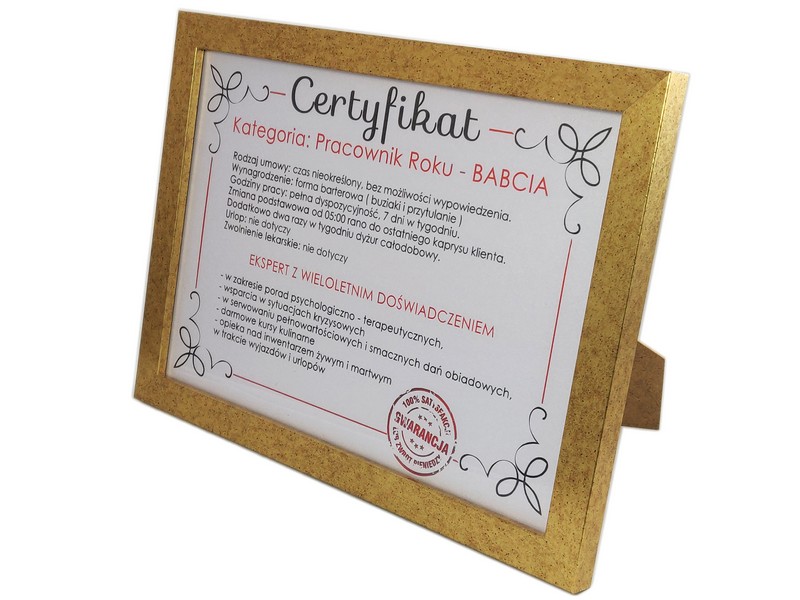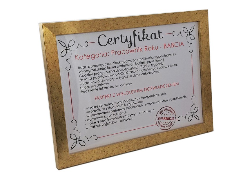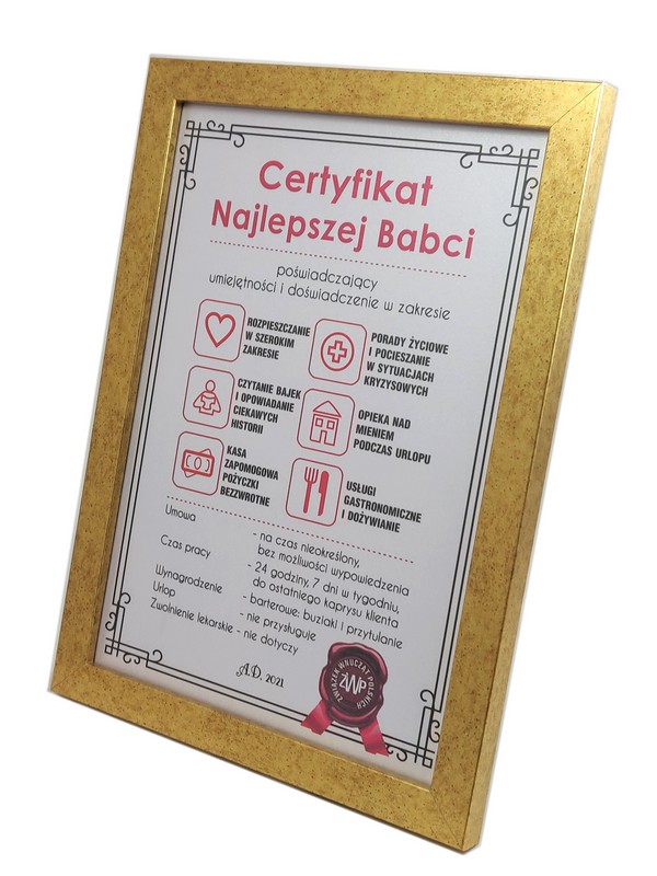 Certyfikat Najlepszej Babci w złotej drewniano-szklanej ramie.