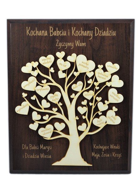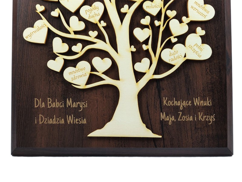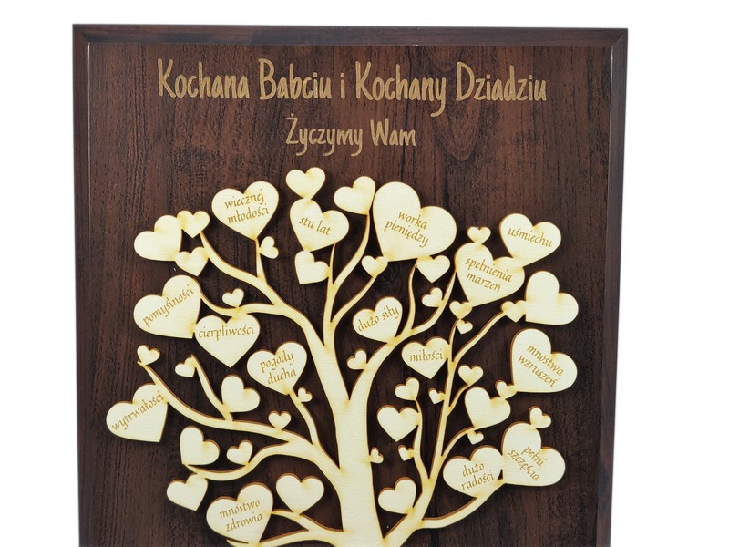 Na serduszkach obrazujących liście drzewka wygrawerowane są poszczególne życzenia dla dziadków.