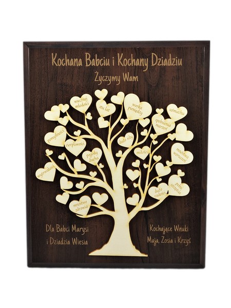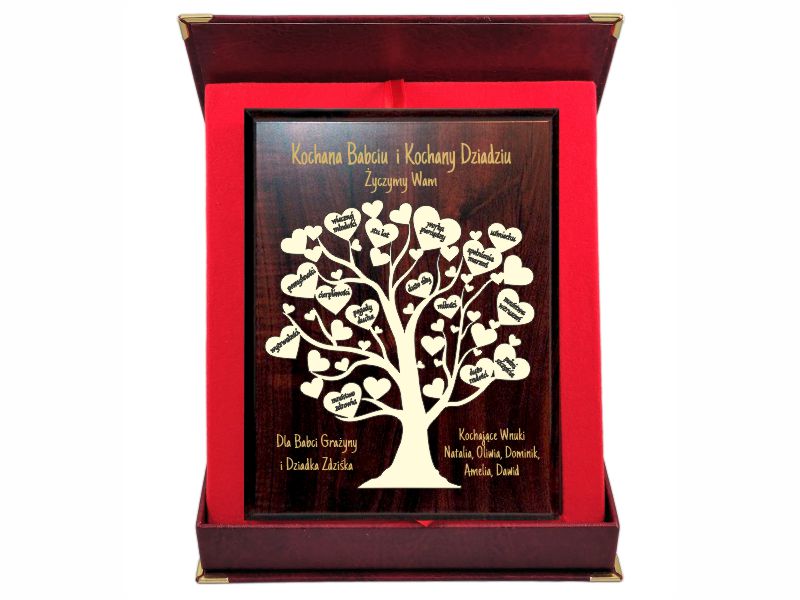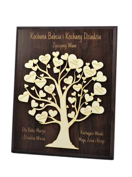 Dodatkowa dedykacja, imiona dziadków oraz wnuków wygrawerowane są bezpośrednio w drewnianym podkładzie.