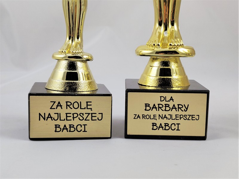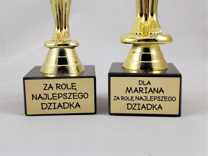 Na postumencie statuetki można wykonać tabliczkę z dowolną dedykacją. Można wykorzystać jeden z wzorów lub wykonać inną dowolną dedykację. W szczególności można zindywidualizować treść przez dodanie imienia - babci, dziadka czy wnucząt.