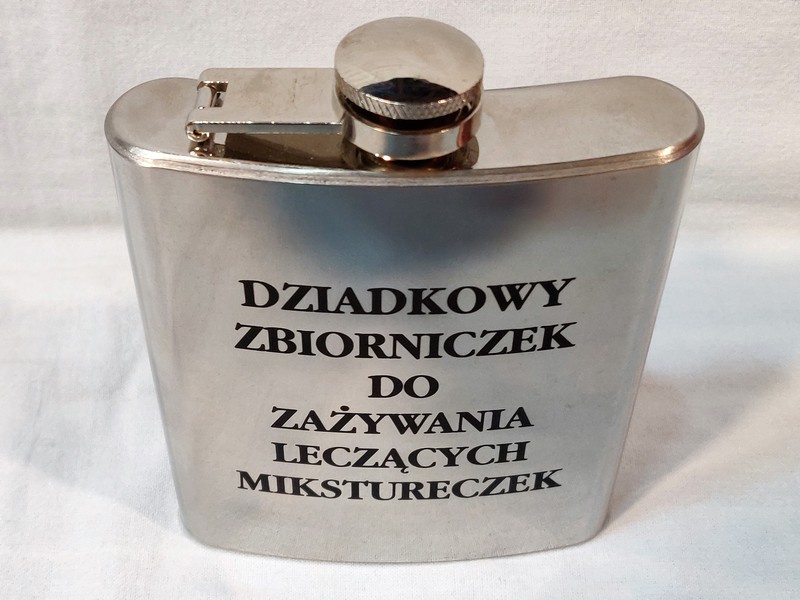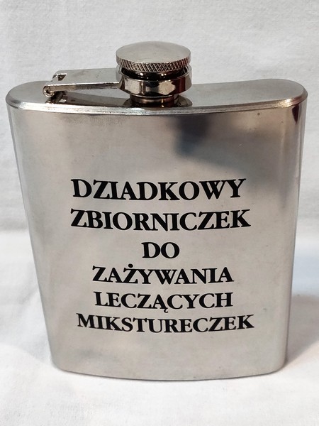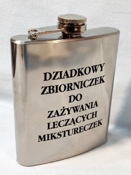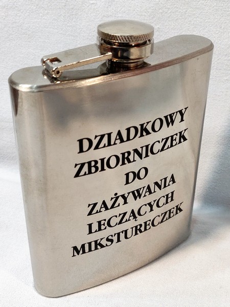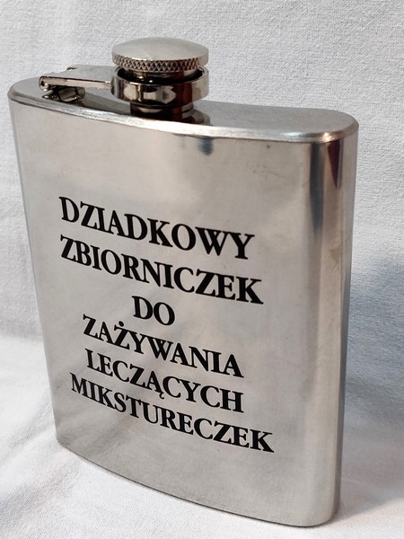 Na piersiówce wykonany jest laserowy grawer dedykacji: "Dziadkowy zbiorniczek do zażywania leczniczych mikstureczek".