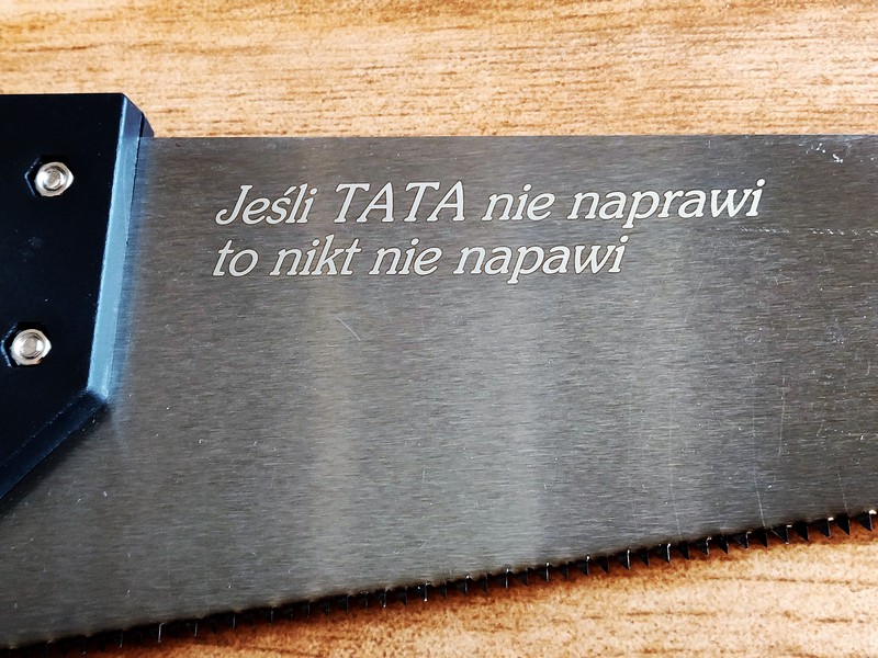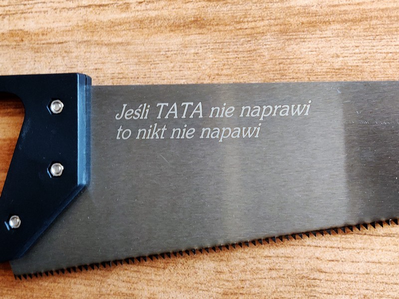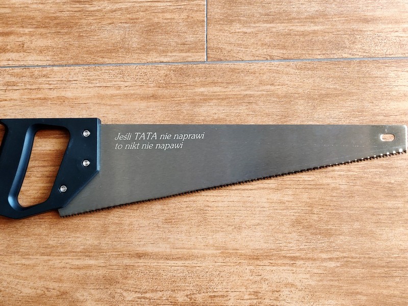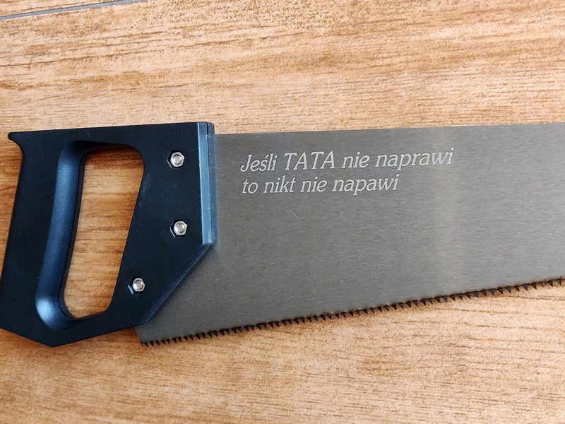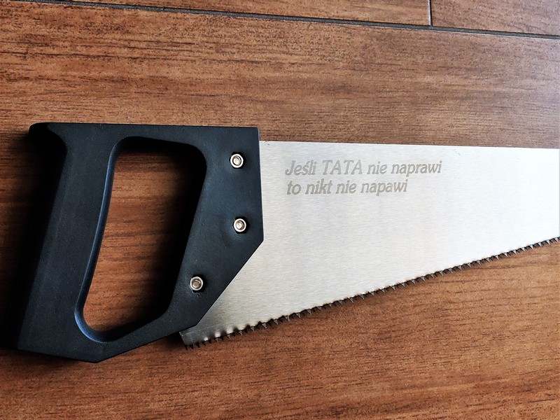 Upominek dla Taty w postaci klasycznej, podręcznej piły do cięcia z grawerem dedykacji.
