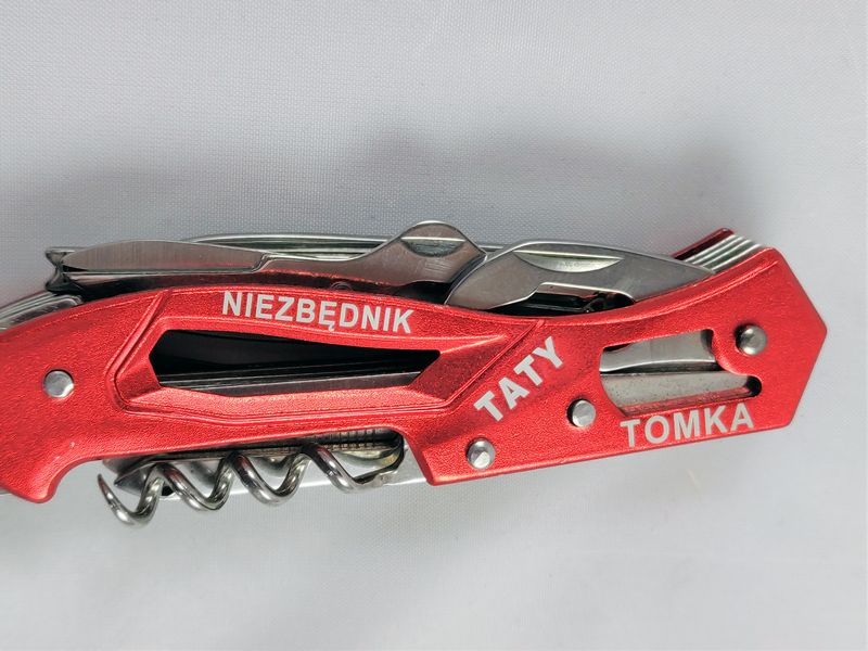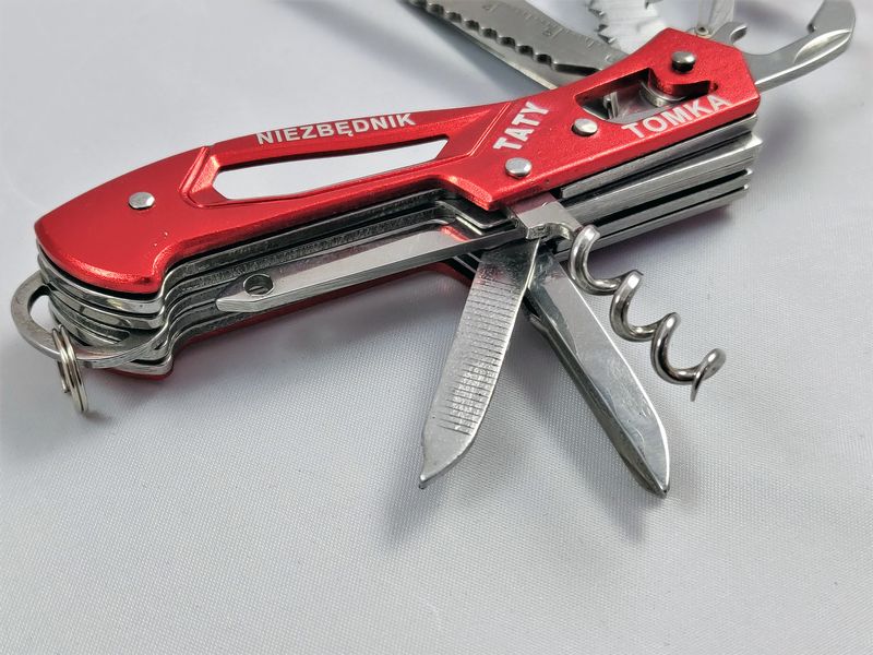 Na okładzinie scyzoryka wykonany jest grawer dedykacji: "Niezbędnik Taty ..."