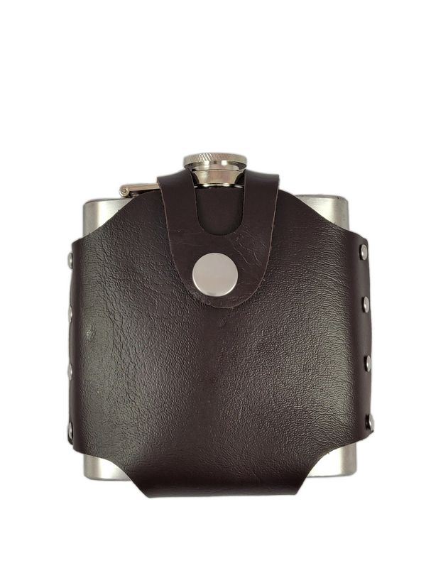 Etui z ekoskóry na piersiówkę jest w brązowym kolorze i ma mocowanie do paska.