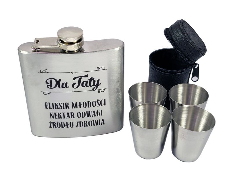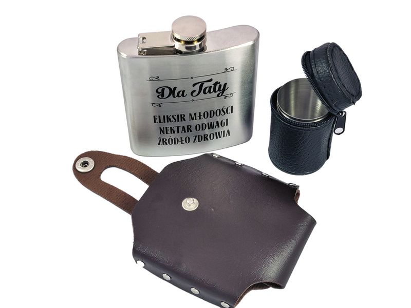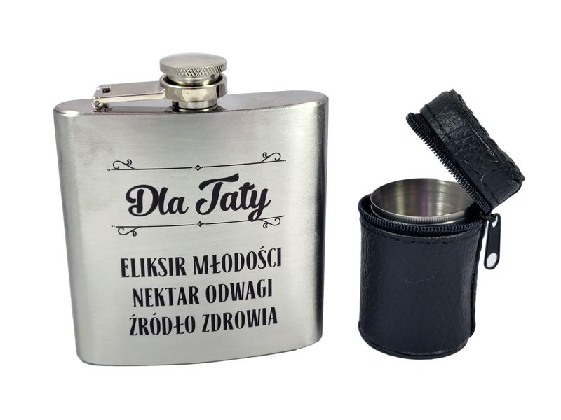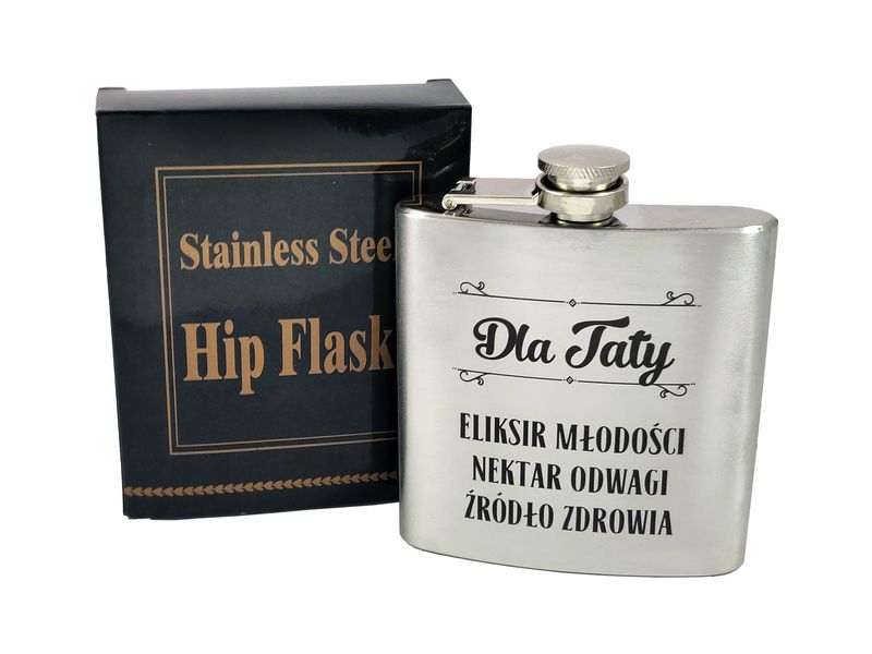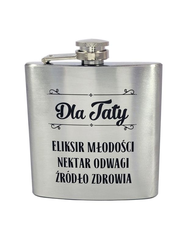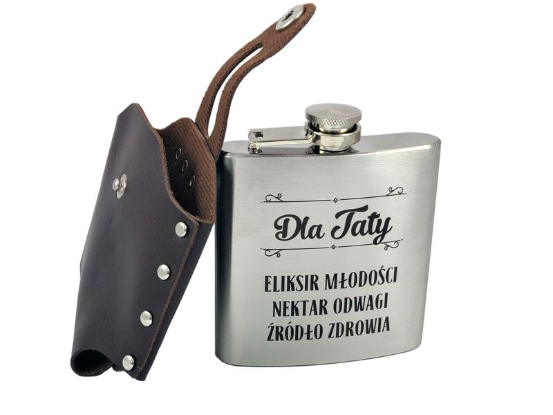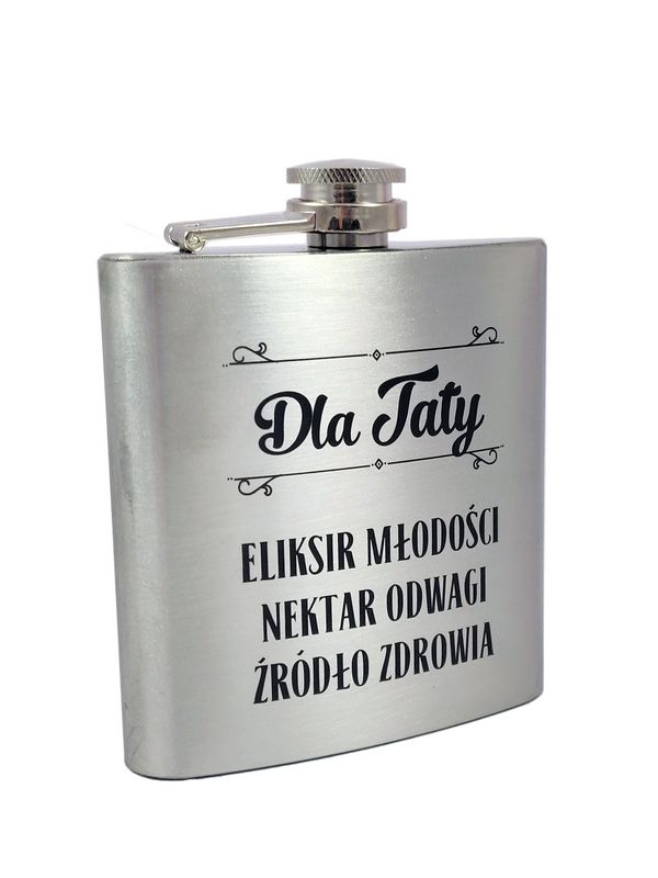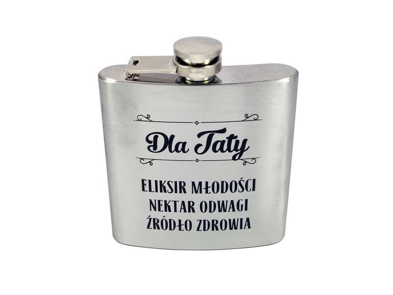 Na piersiówce wykonany jest grawer dedykacji: "Dla Taty. Eliksir Młodości, Nektar Odwagi, Źródło Zdrowia".