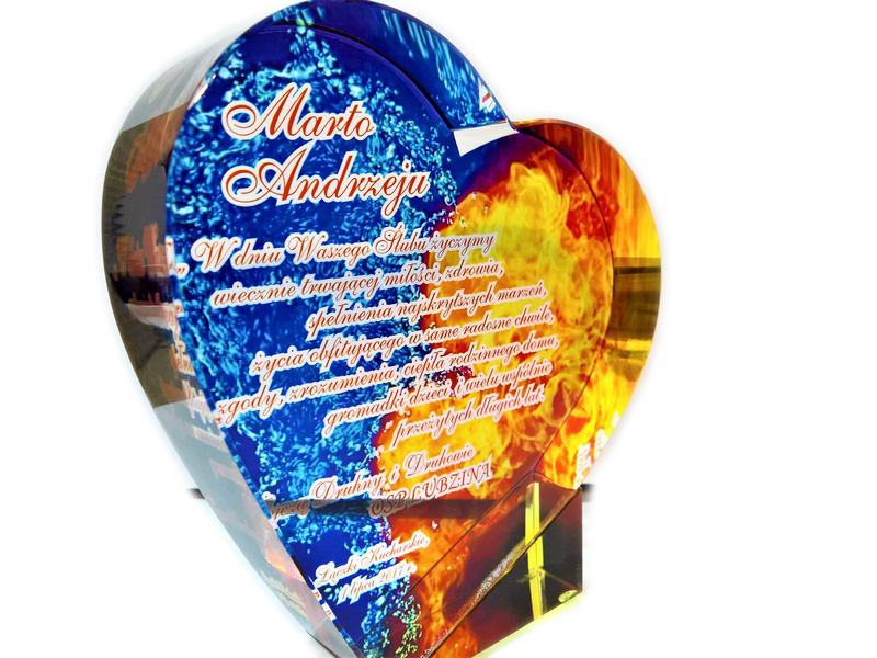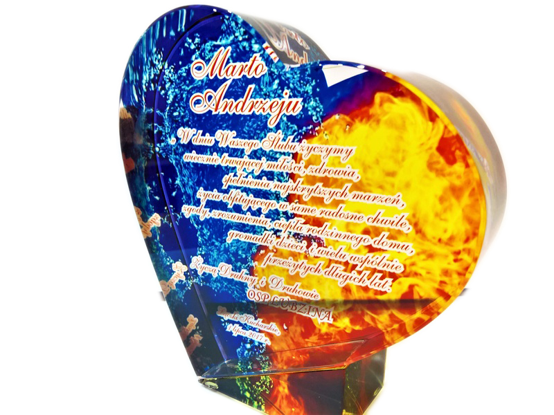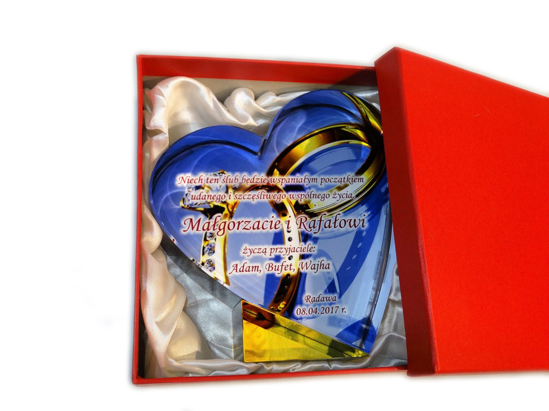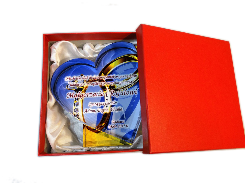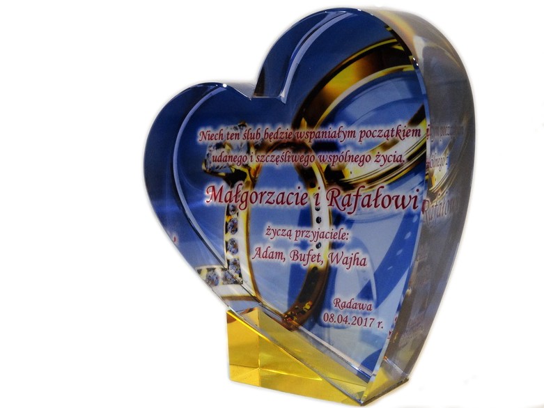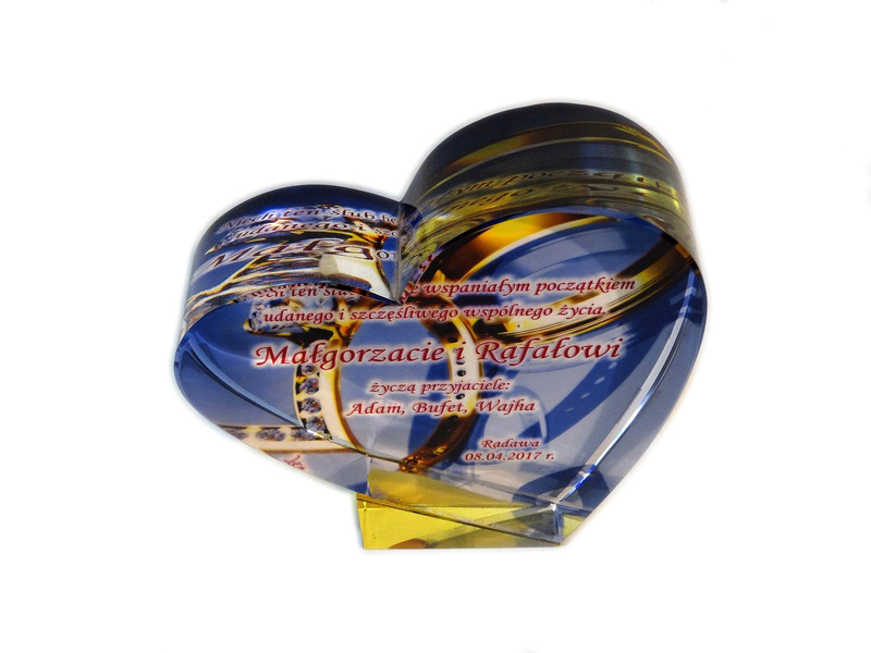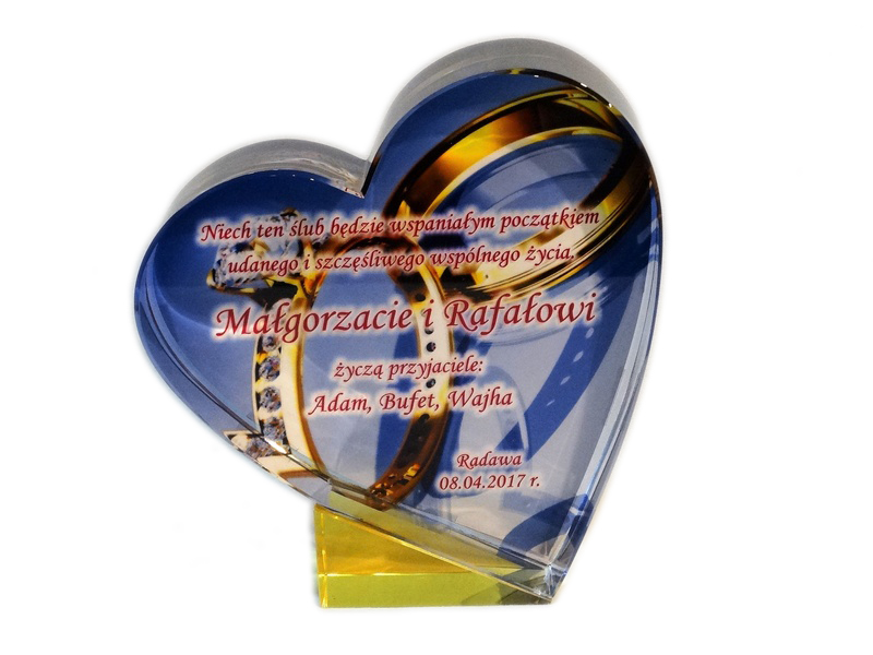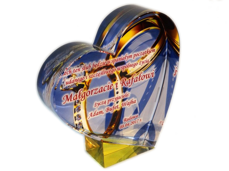 Pamiątkowy upominek na ślub w formie statuetki szklanej C055 "serce" z grubego szlifowanego szkła z nadrukiem.